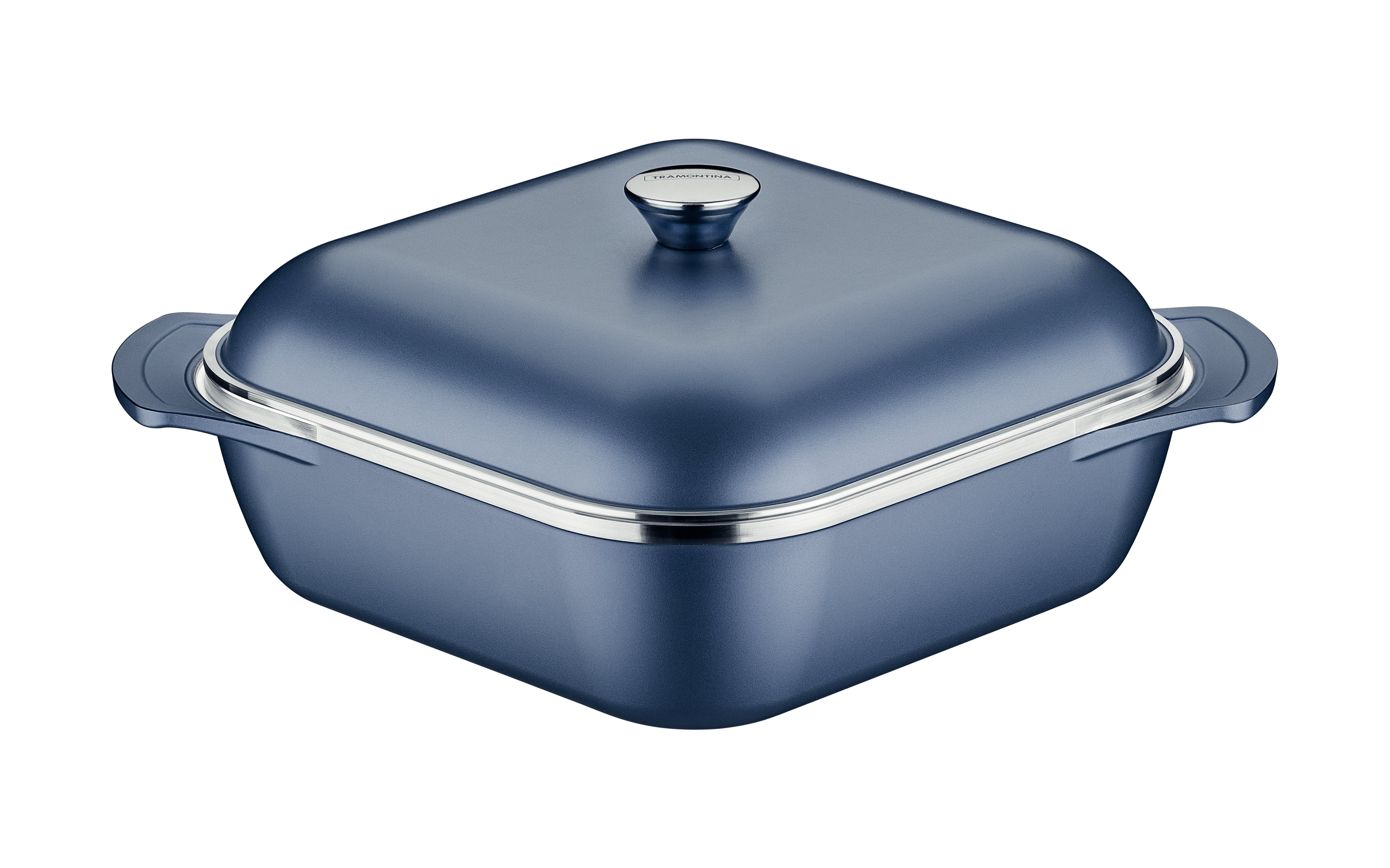 Tramontina Lyon elemental blue forged aluminium square casserole with interior and exterior Starflon High-Performance nonstick coating, 28 centimetres and 5.5 litres, is the essential item for your kitchen. With its elegant and functional design, this casserole was developed from high-quality aluminium, ensuring strength, durability and quick and uniform preparation. Its interior coating is made of Starflon High Performance nonstick and makes preparing food much more practical and healthier, as it prevents food from sticking to its surface. Versatile and practical, it can be used on all types of stoves, including induction. And if you want to take your dishes from the stove straight to the oven, do not worry!