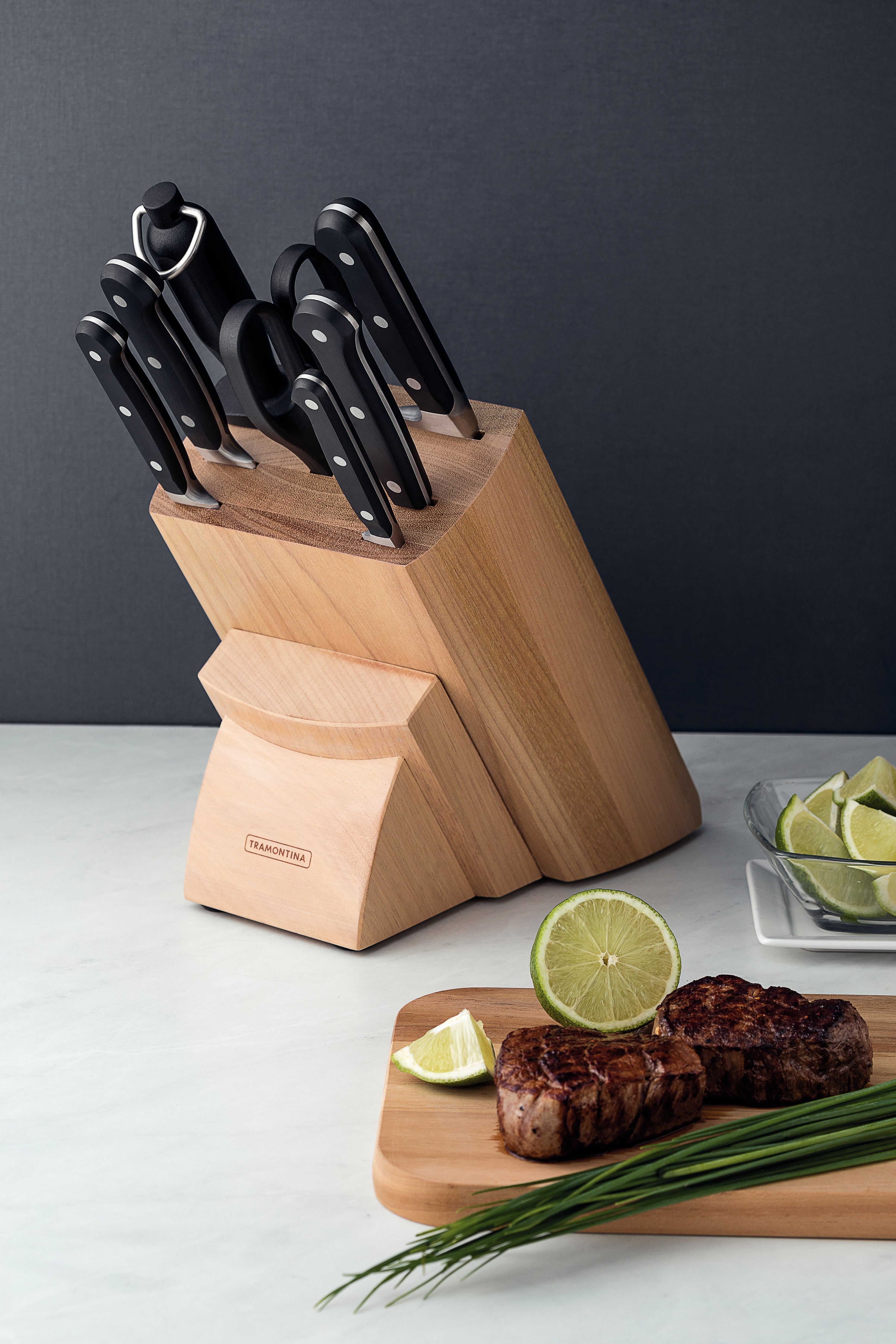 There is nothing more elegant and practical in a good kitchen than a set of knives that offer quality, beauty and presence. For this, you can count on the Tramontina Century 8-piece knife set with stainless-steel blades, fiberglass-reinforced polycarbonate handles and wood stand. Unparalleled quality, durability and performance are guaranteed by blades forged from the highest quality stainless steel, combined with efficient, distinctive heat treatment to provide a cutting edge with greater durability and precision. Safety and precision are the result of the fiberglass-reinforced polycarbonate handle, which ensures high durability, balance and safety. The wood stand brings added elegance and beauty and offers protection for the knives. Ideal for those who want all the ease and advantages of a magnificent set in their kitchen! In addition, the knives are dishwasher safe, facilitating your daily life. Turn your kitchen into a sophisticated and functional environment with the Tramontina Century knife set. Be amazed by the quality and design of this set that is a true partner in the culinary art!