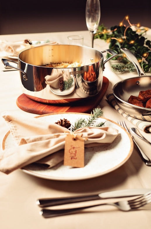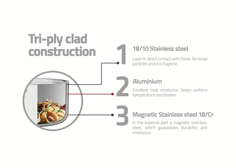 • The triple-ply body (stainless steel + aluminum + stainless steel) distributes heat evenly, resulting in quick and uniform cooking, saving power and keeping food warm for longer.