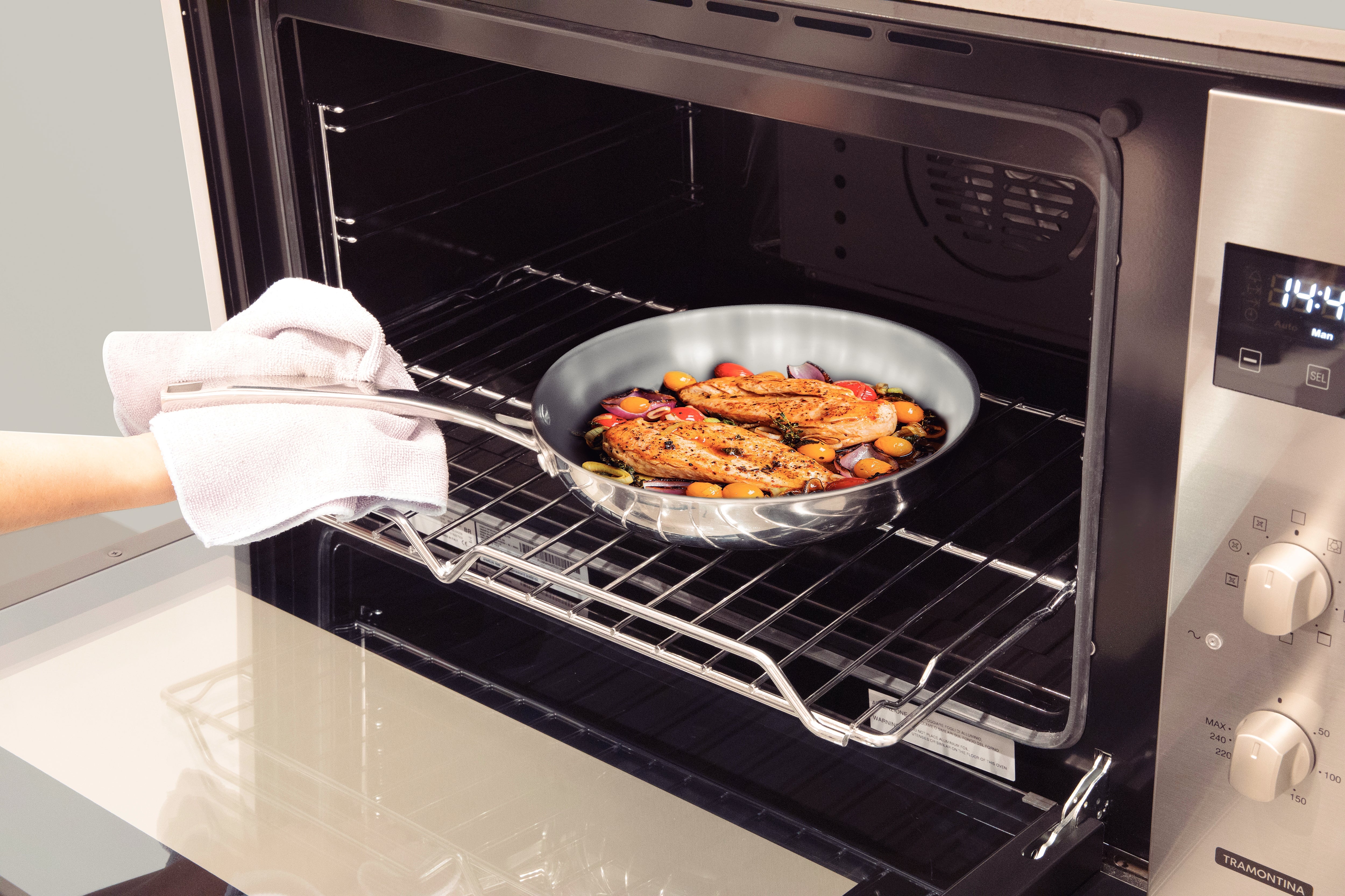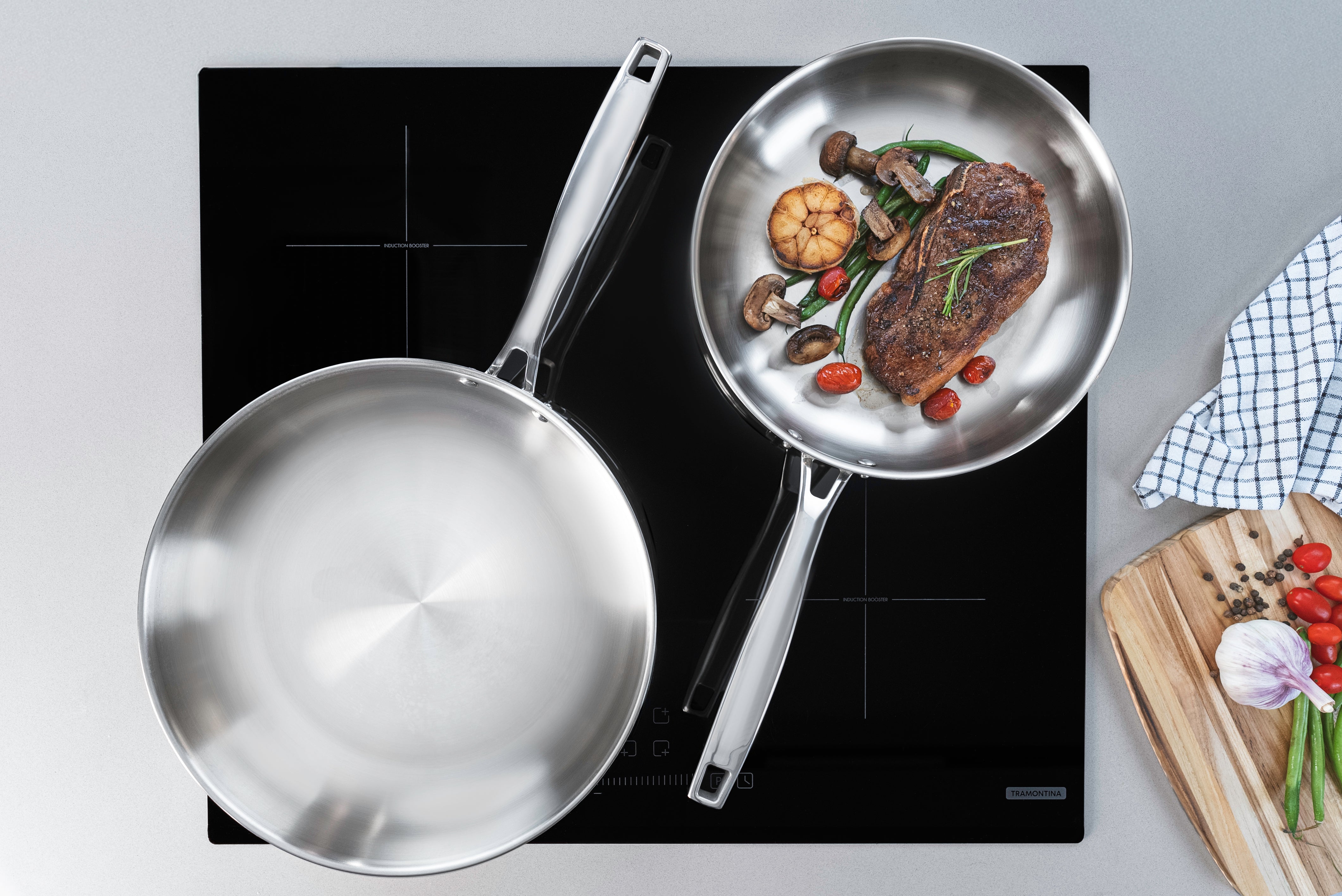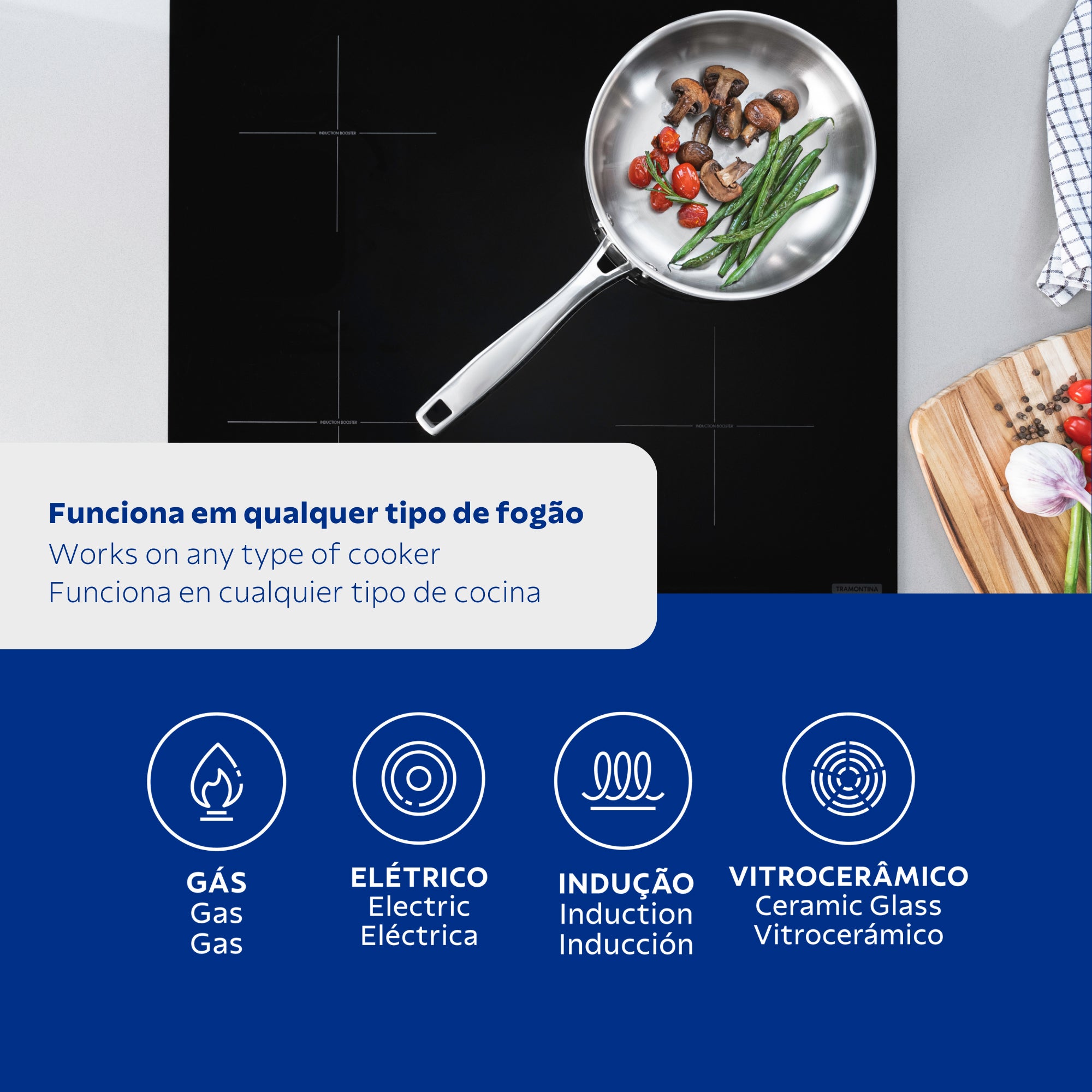 Some products are indispensable in our kitchen, like Tramontina's Grano 26 cm 2.2L shallow stainless steel frying pan with tri-ply body and long handle. Very convenient with its modern design, it has a tri-ply body (stainless steel + aluminum + stainless steel), which speeds up the cooking process. The rounded corners make it easier to clean and it can go in the dishwasher on a daily basis. Its sophisticated appearance is impressive due to the high-gloss finish, making this the perfect item for serving at the table. With a 26 cm diameter, it is highly versatile and can be used on various types of cooktops: gas, electric, glass ceramic and induction.