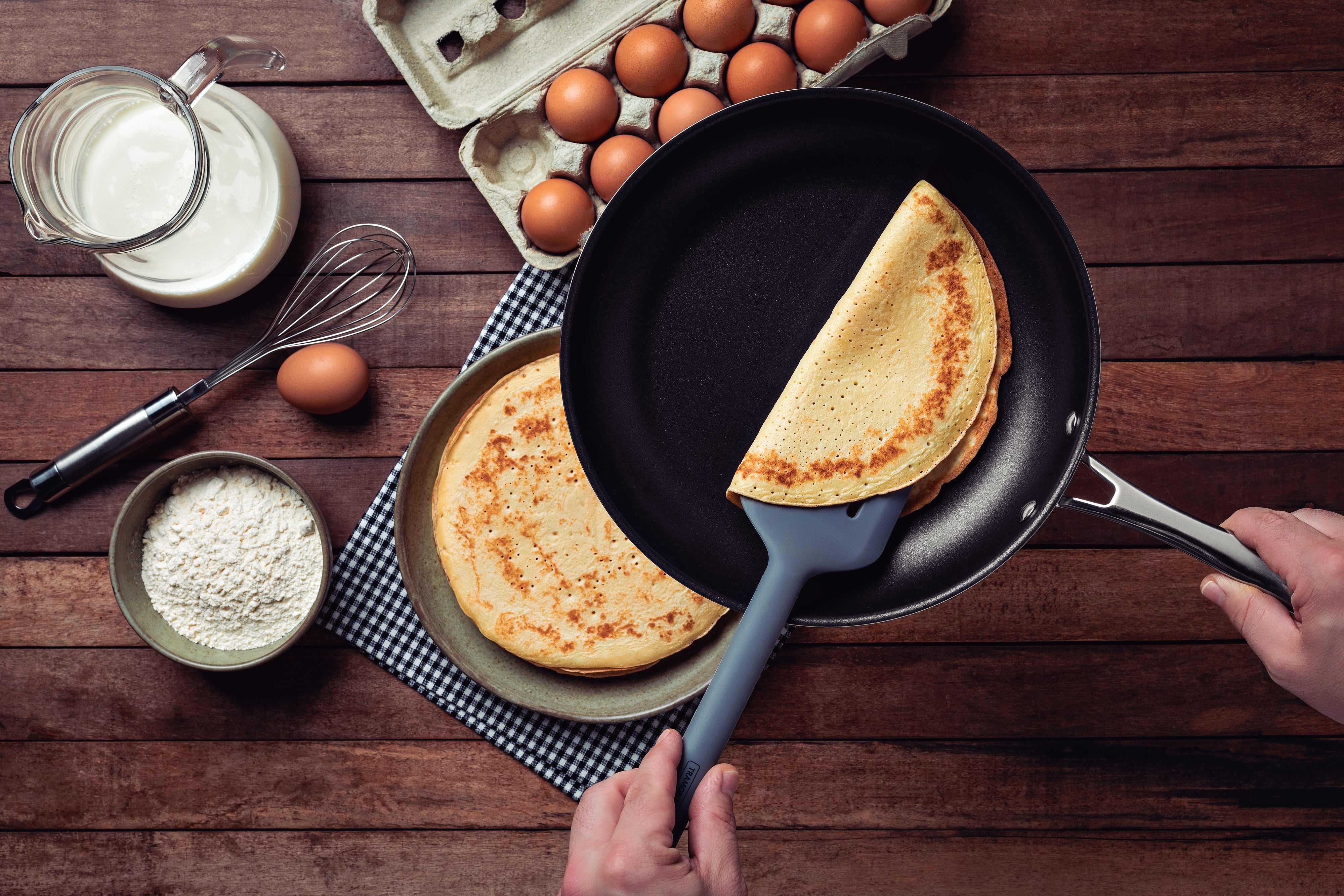 - The frying pan has a modern design and highly shiny finish, and can be set on the table.