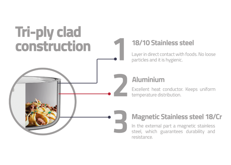 - The triple-ply body (stainless steel + aluminum + stainless steel) distributes heat evenly, resulting in quick and uniform cooking, saving power and keeping food warm for longer.