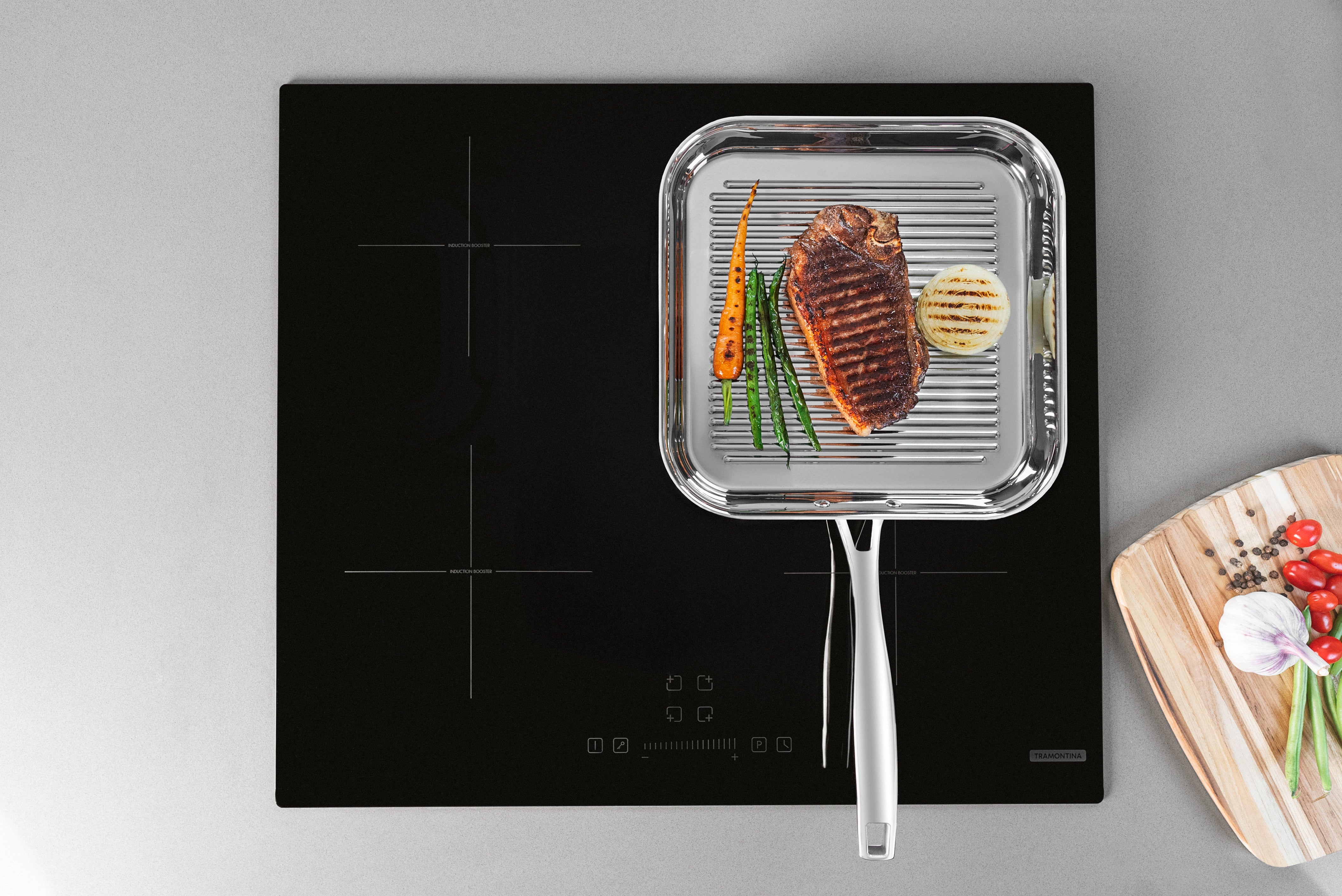 Your dishes will level up with Tramontina's Grano 1.9 L stainless steel griddle pan. For versatile cooking, it is perfect for grilling your best meat, fish and vegetable dishes. It is also impressive due to its functionality. This griddle pan can go in the oven to brown or finish dishes and can be used on different types of cooktops. Made of highly durable stainless steel with tri-ply body (stainless steel + aluminium + stainless steel) technology. This characteristic distributes heat evenly for faster and more efficient cooking. It also keeps your food warm for longer. The contemporary design makes it a great choice for serving at the table. This product is also very easy to clean and dishwasher safe.