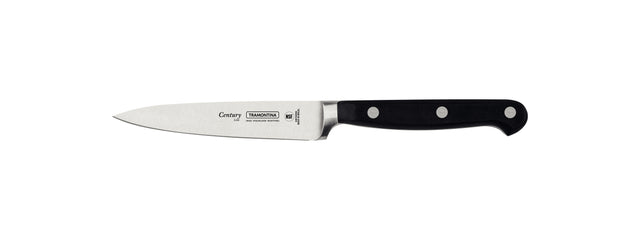 Transform your kitchen experience with the Tramontina Century 4-inch vegetable and fruit knife with stainless-steel blade and fiberglass-reinforced polycarbonate handle. Perfect for cutting, peeling and decorating vegetables and fruit, it offers practicality and precision for preparing your recipes. With a blade forged from special stainless steel that ensures a long-lasting, precise cutting edge, it undergoes distinctive heat treatment, consisting of tempering, sub-zero quenching and annealing, ensuring greater edge strength and precise cutting. You will have a knife that stays sharp for much longer. The fiberglass-reinforced polycarbonate handle offers durability and balance. Moreover, the ergonomic design offers safety and comfort during handling. You can use this knife for hours without feeling any discomfort in your hands. It is easy to clean as it is dishwasher safe, making your kitchen routine easier and more practical. Invest in quality, performance and style with the Tramontina Century vegetable and fruit knife and discover how it can revolutionize your recipe preparation!