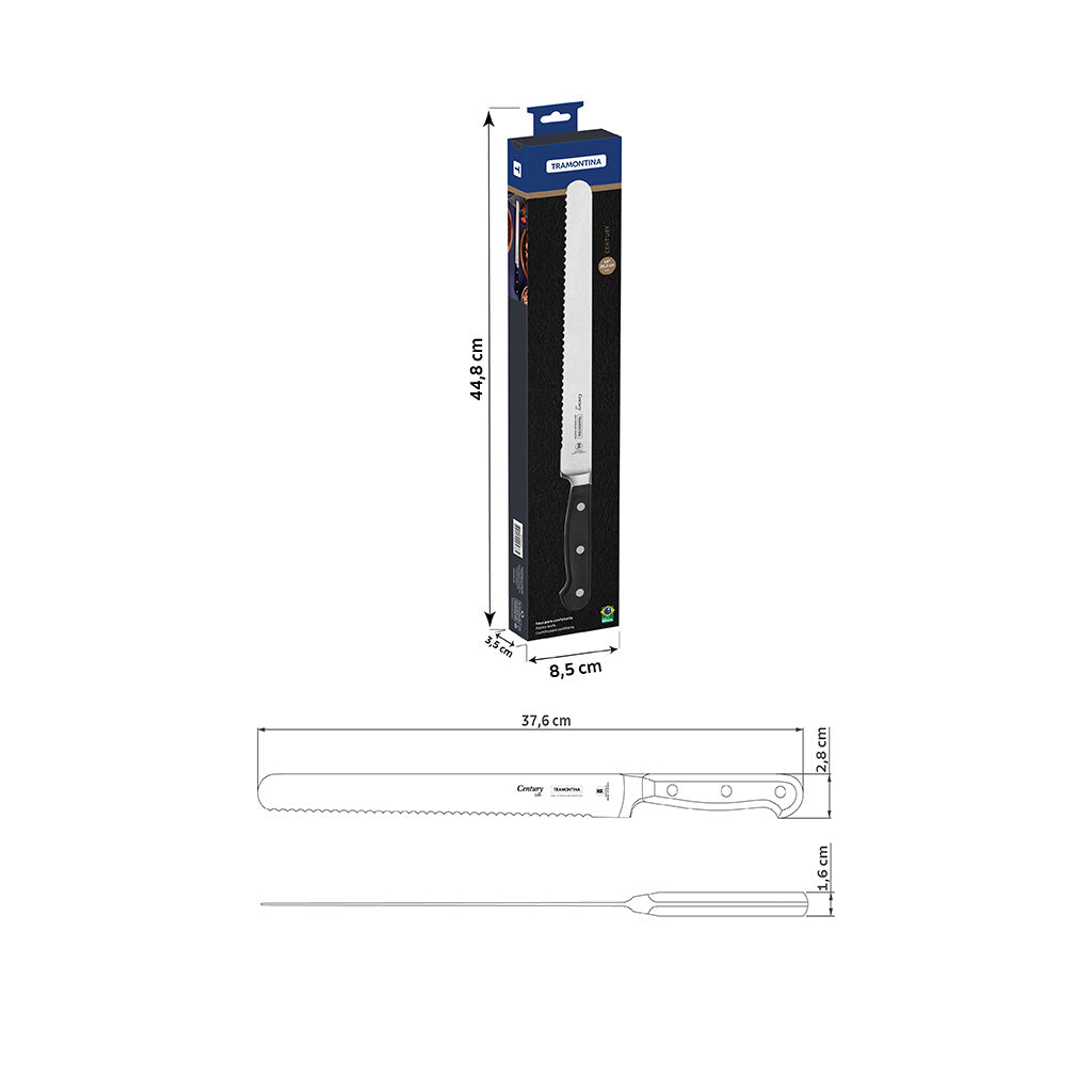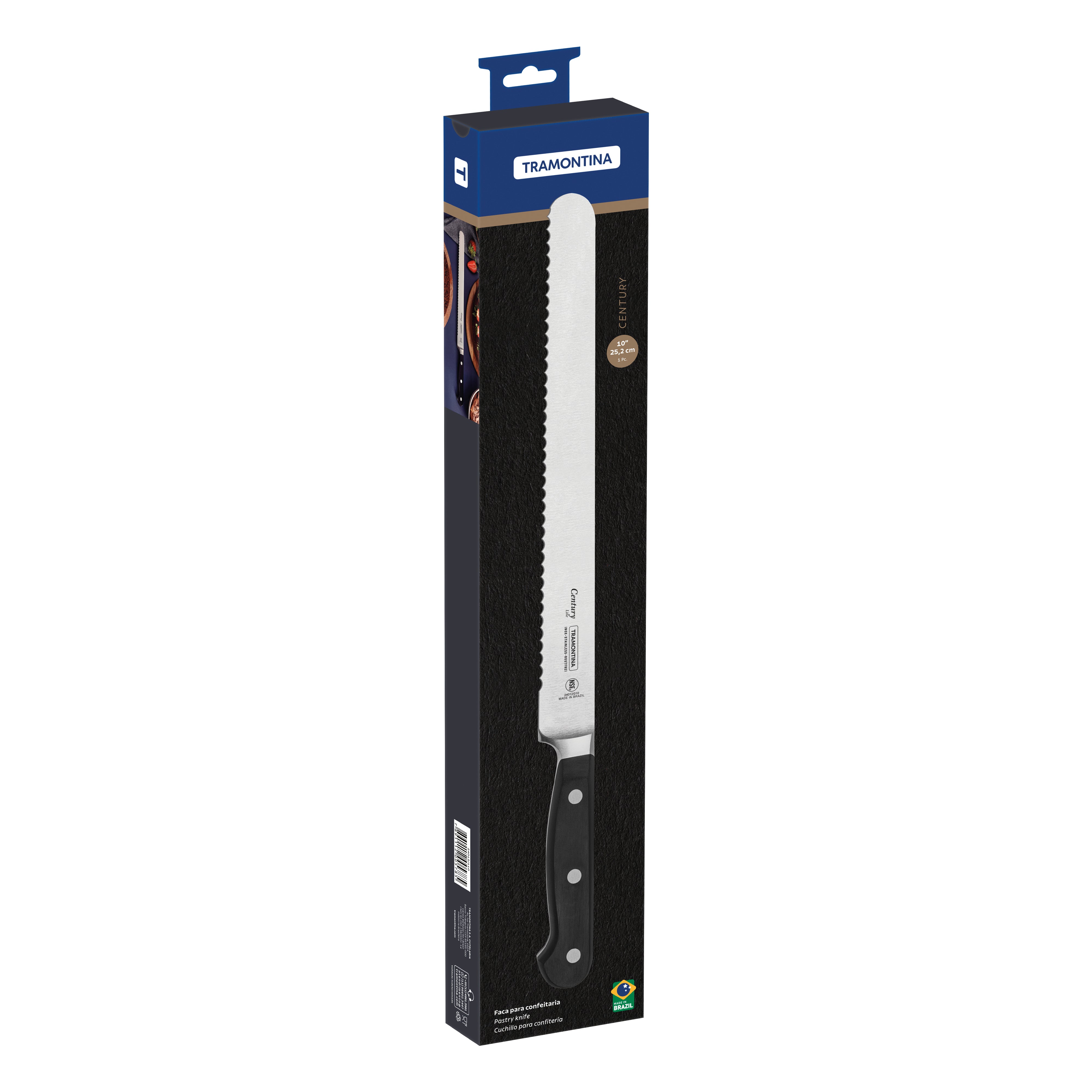The Tramontina Century 10-inch pastry knife with stainless-steel blade and fiberglass-reinforced polycarbonate handle is the secret to perfectly cutting cakes and pies. Its long, serrated blade allows for precise, smooth cutting, ensuring professional results in your recipes. It is forged from special stainless steel that undergoes heat treatment, consisting of tempering, sub-zero quenching and annealing, which ensures a strong edge and precision for cutting. The fiberglass-reinforced polycarbonate handle is ergonomic and offers comfort and safety during handling. This knife is also easy to clean as it is dishwasher safe, facilitating your kitchen routine. With the Tramontina Century pastry knife, you will have the ideal item for creating incredible desserts with precision and style. Add this knife to your kitchen and experience the difference it can make in your recipes!