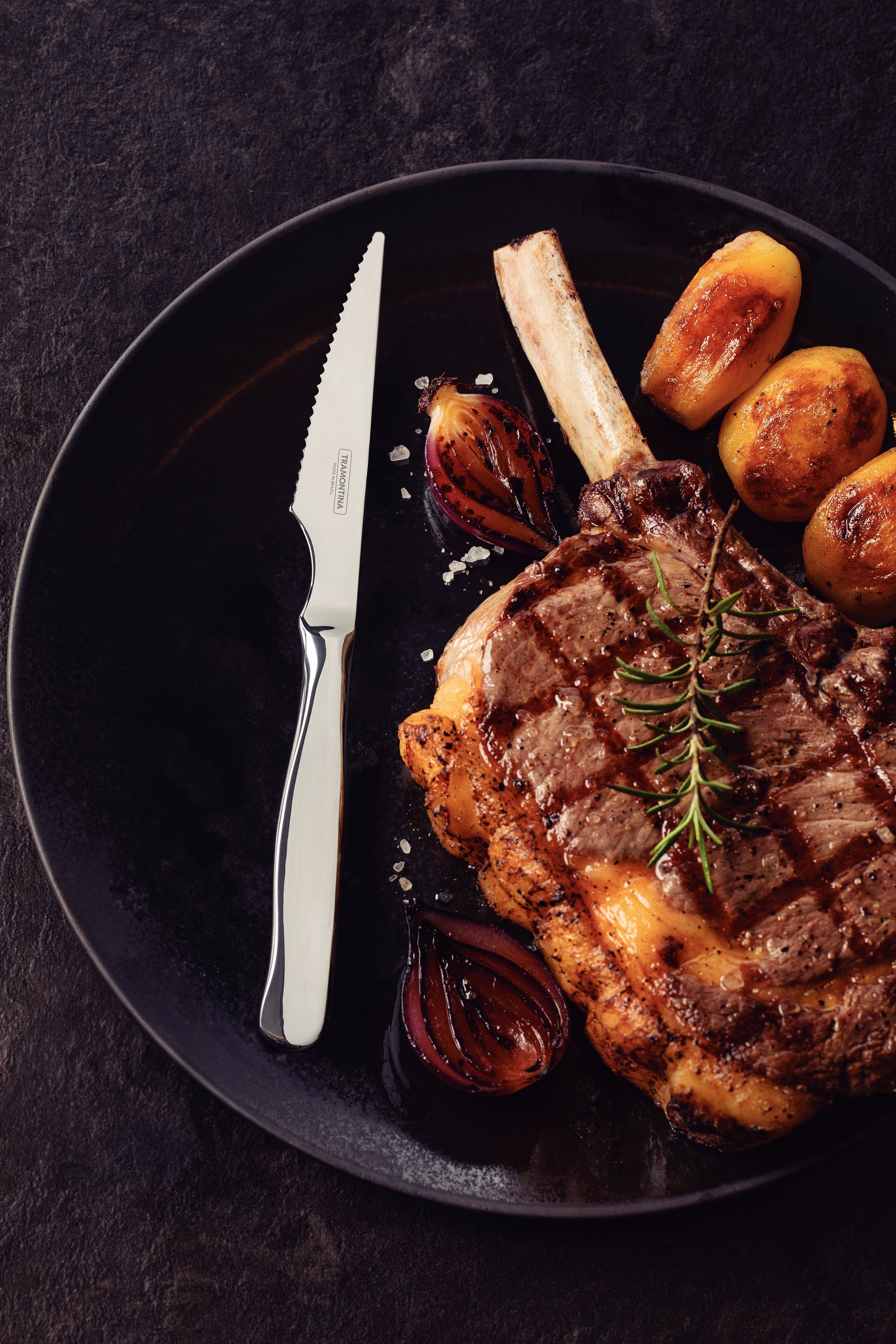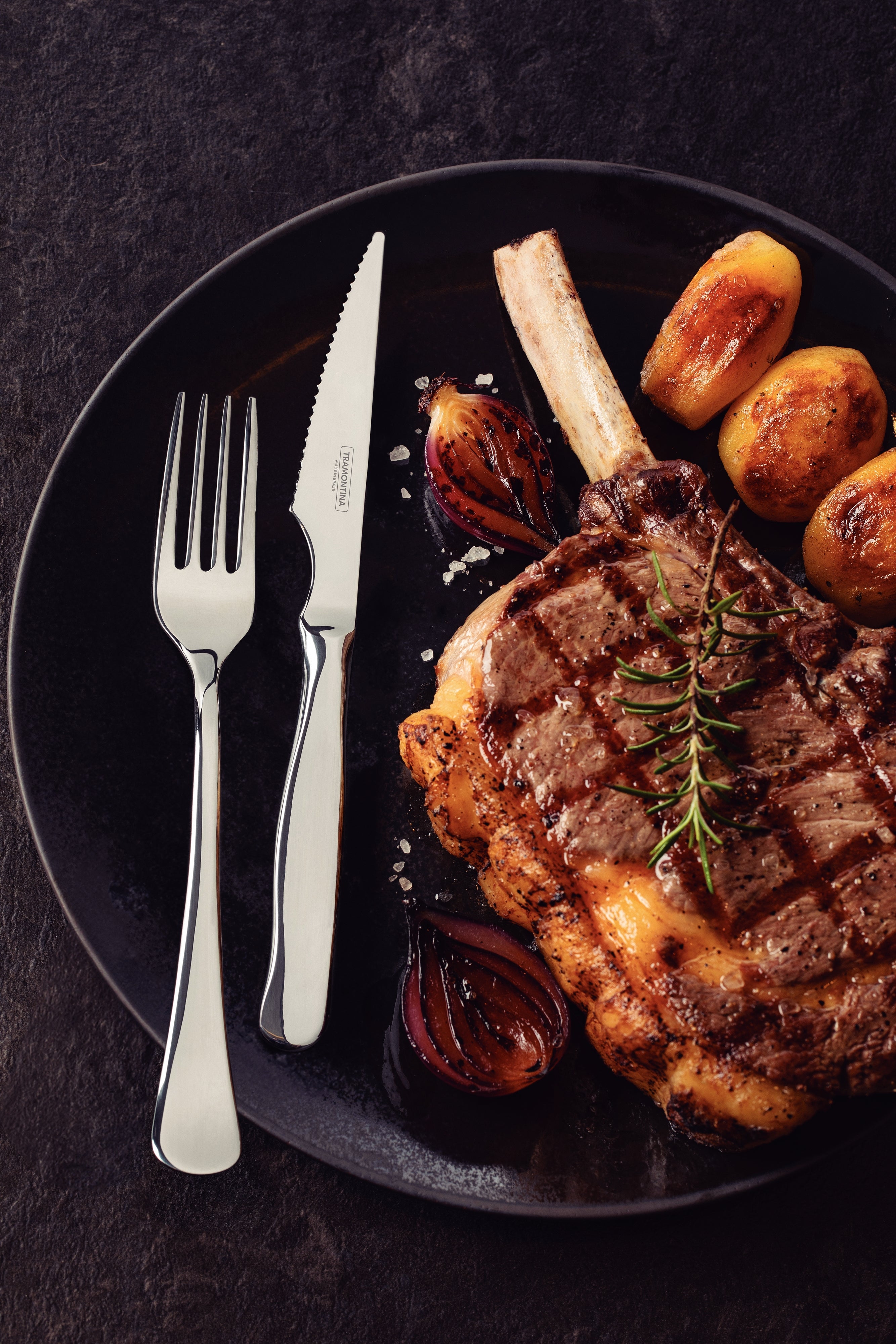 With Tramontina's 12-piece stainless steel barbecue set with knives with serrated edges and mirror finish from the Zurique line, you can enjoy a good barbecue in a unique way. The set includes knives with tempered blades and serrated edges, ensuring a longer-lasting cutting edge and greater resistance to rust. Due to these features, they don't scratch the dishes. It also includes forks with polished and nicely shaped tines and rounded edges for more comfortable use. The pieces are made of stainless steel for greater durability, maintaining their original condition for a longer time. The handles were made to fit easily into the palm of the hand. There is a harmonious balance between the handle and the blade. The mirror finish adds elegance to any décor.