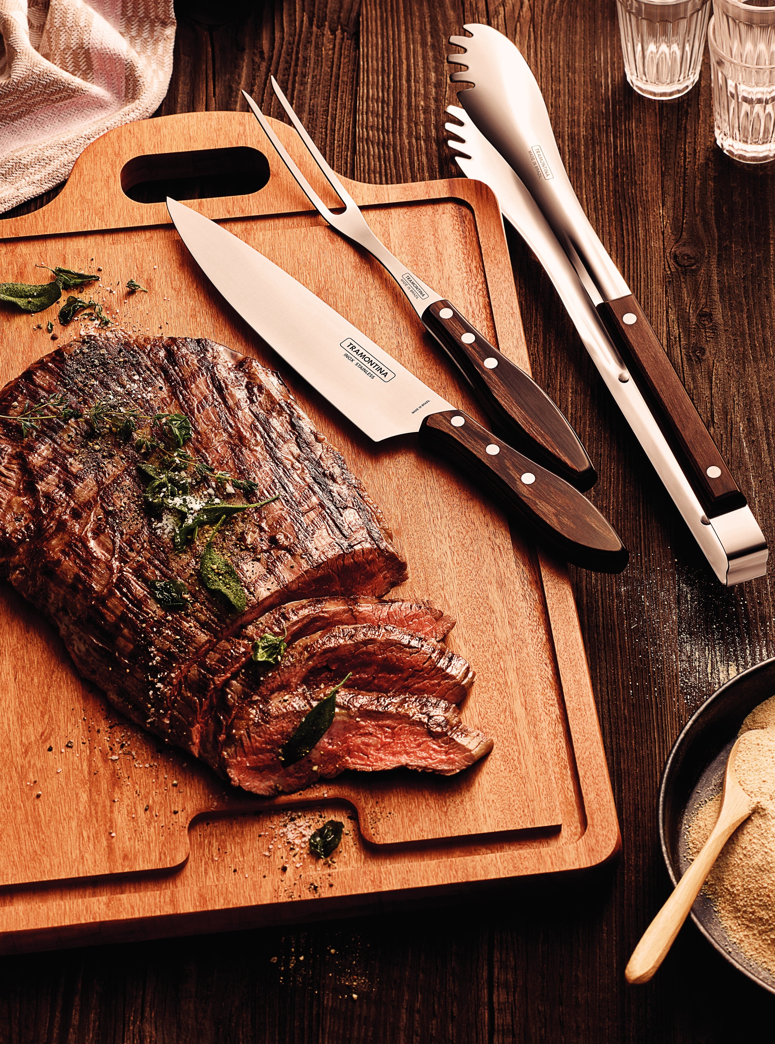Tramontina's Churrasco line offers a complete solution for you to prepare and serve a delicious barbecue. With Tramontina's 3-piece utensil set with stainless-steel blades and treated brown Polywood handles, you will have the possibility of excellent cutting performance and more convenience for serving. The pieces are made of highly durable steel with treated Polywood handles which offer resistance to shock and high temperatures. A choice that will do beautifully well on every occasion.
