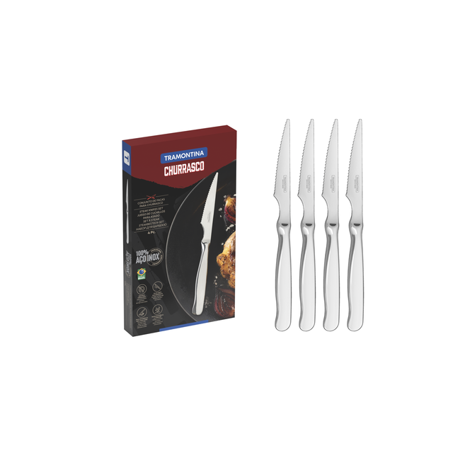 Make your barbecue a time of enjoyment with Tramontina's 4-piece stainless steel steak knife set. This sophisticated design will add even more elegance to your table. The items are made of stainless steel for even greater durability and excellent maintenance of their original condition. The knives have tempered blades, which ensures a longer-lasting plain cutting edge and greater resistance to rust. Due to these features, they don't scratch the dishes. In addition, they have a harmonious balance between the handle and the blade. The handle is comfortable to use as it fits easily in the hand.