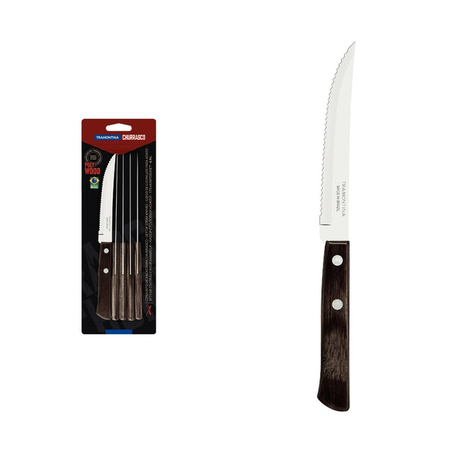 A good barbecue can't do without high-quality knives. With the Tramontina 6-piece set steak knives with stainless-steel blades and brown Polywood handles you will be able to cut and enjoy delicious grilled meats effortlessly and easily. The blades are made of stainless steel, offering high durability and cutting quality and the treated Polywood handles guarantee resistance to impacts and high temperatures. Moreover, they will bring a merging of rustic and modern to your table.