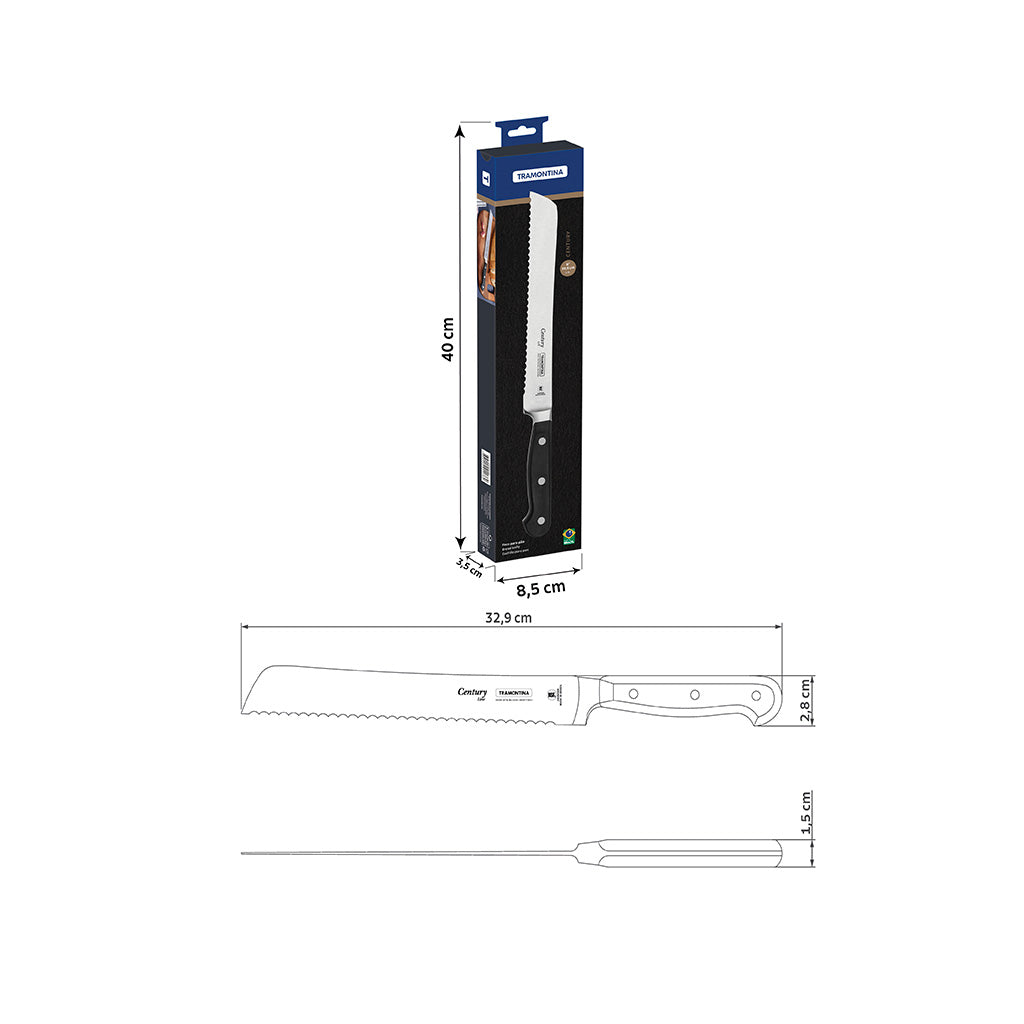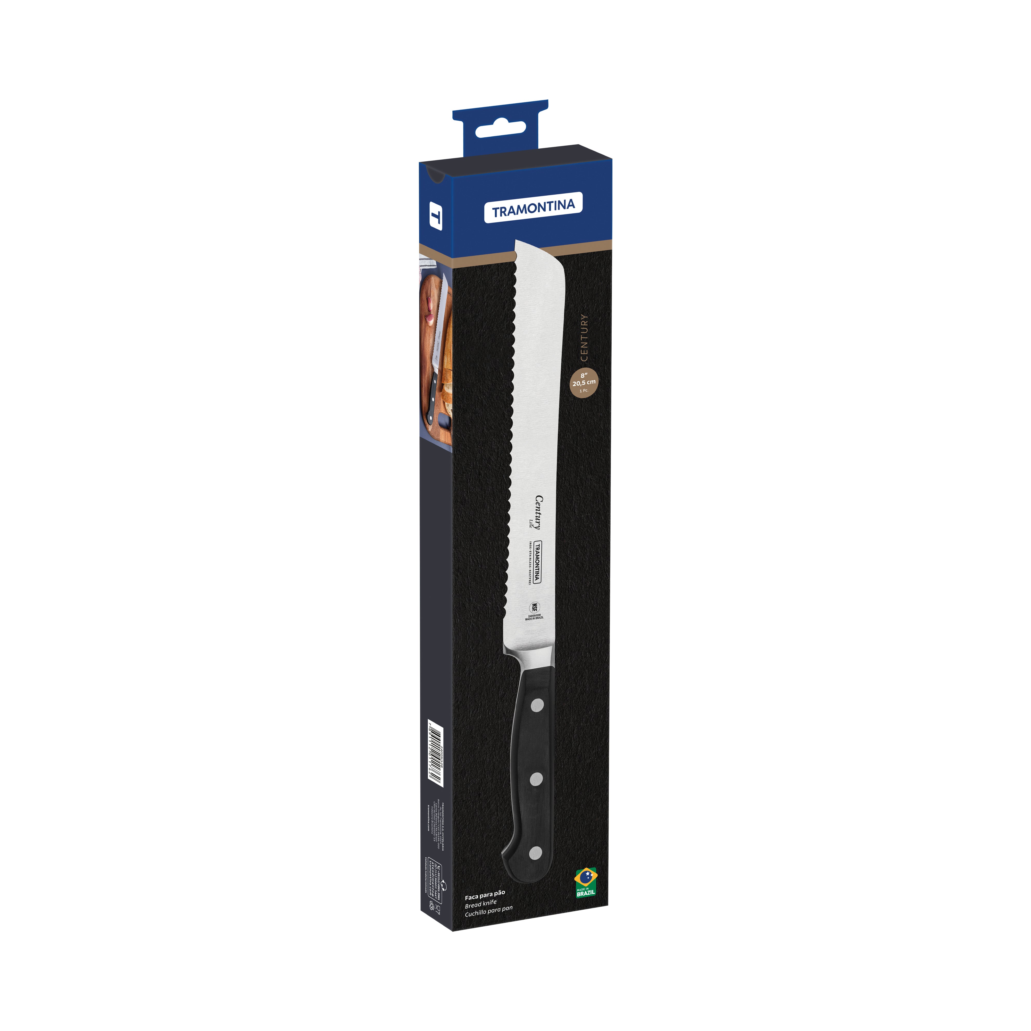The Tramontina Century 8-inch bread knife with stainless-steel blade and fiberglass-reinforced polycarbonate handle is perfect for all types of bread and indispensable for cutting this delicate food. Its serrated blade cuts bread without crushing it, ensuring that you can enjoy perfectly cut slices every time. The knife's handle is made of fiberglass-reinforced polycarbonate, ensuring durability and balance. Moreover, its ergonomic design offers safety and comfort during handling. The Tramontina Century bread knife is very practical, because it is dishwasher safe. This will make your daily kitchen routine even easier, allowing you to enjoy the pleasure of savoring delicious bread with peace of mind!