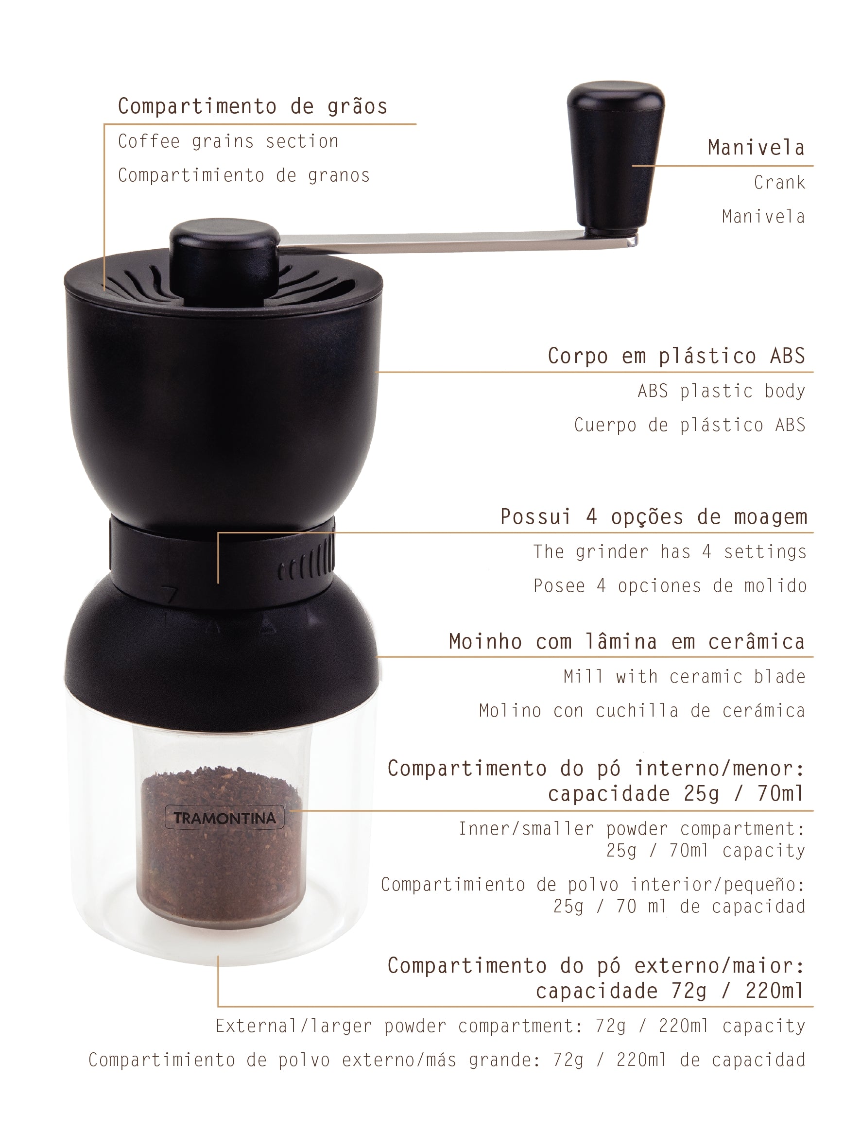 Your experience with coffee will be even more special with the Tramontina ABS plastic coffee grinder with ceramic burr. It lets you grind coffee beans in a super-practical and effective way because it has a bean size adjuster and a grinder with a ceramic blade. Rely on Tramontina to prepare delicious coffee!
