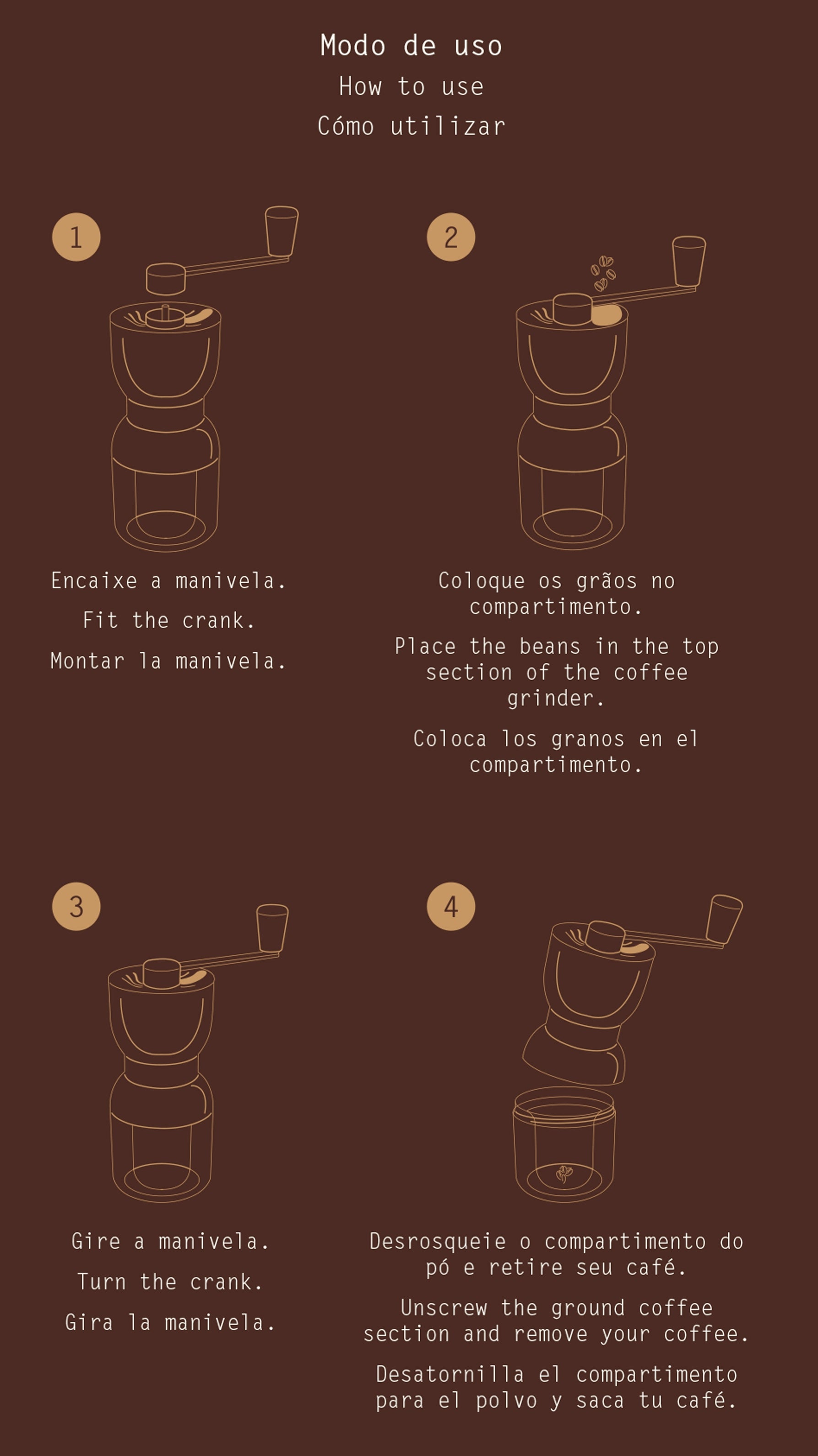 Recommendations for use: Unscrew the bottom of the coffee grains section to access the inside and the blade. Wash with water and mild detergent before using. Avoid using abrasive products that could scratch/damage the part.