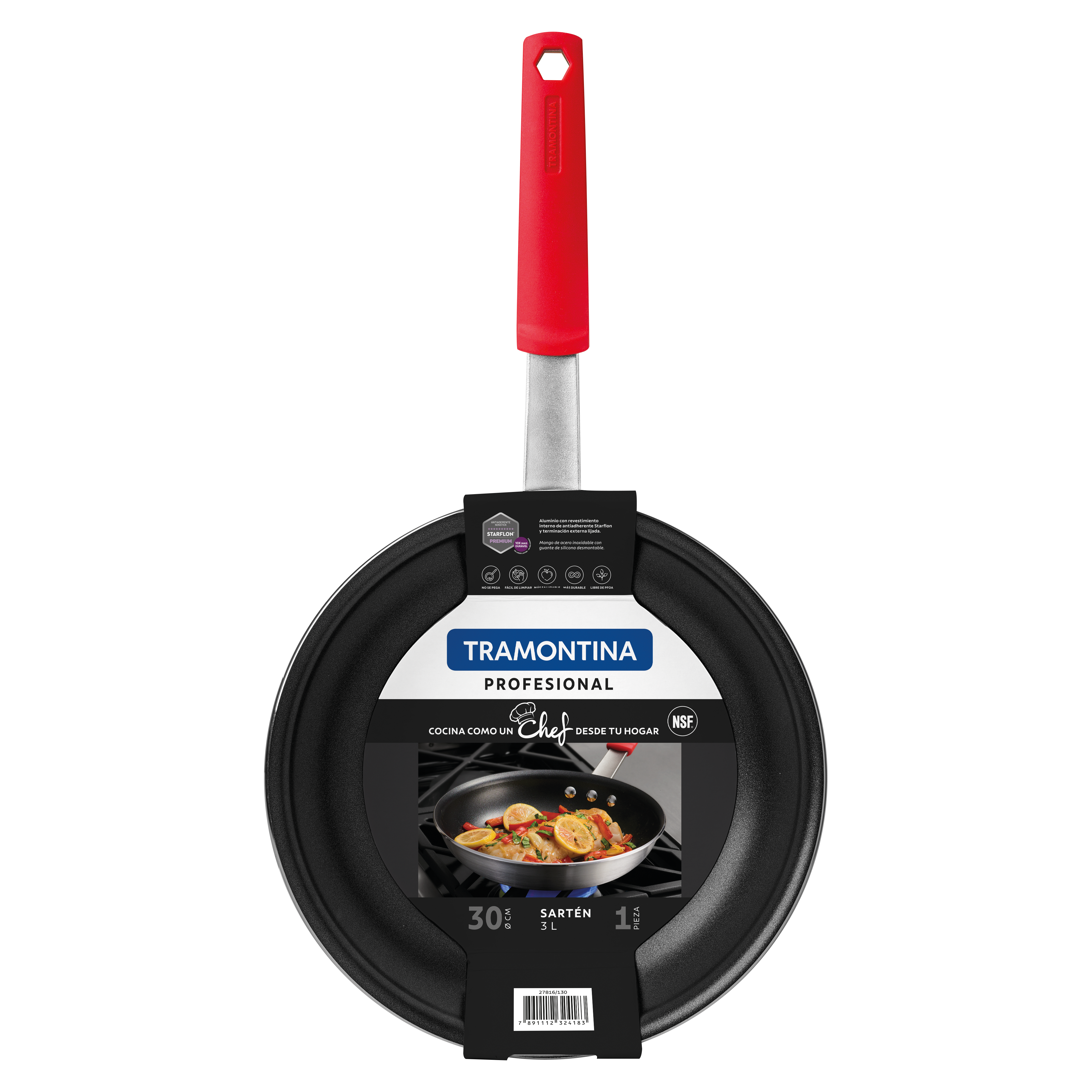 With Tramontina's 30-centimeter, 3-liter aluminum frying pan with Starflon Premium internal coating and brushed exterior, you?ll feel like a chef in your own kitchen. Perfect for those who do not compromise on quality and functionality, this frying pan has a 3.2 millimeter thick aluminum body that provides fast and uniform cooking, and comes with internal Starflon Premium nonstick coating, a material that prevents surface sticking, is easy to clean, more durable and harmless to health. Its external finish is brushed, the stainless-steel handle is fastened by three rivets and comes with a detachable silicone sleeve for greater safety and stability when handling!