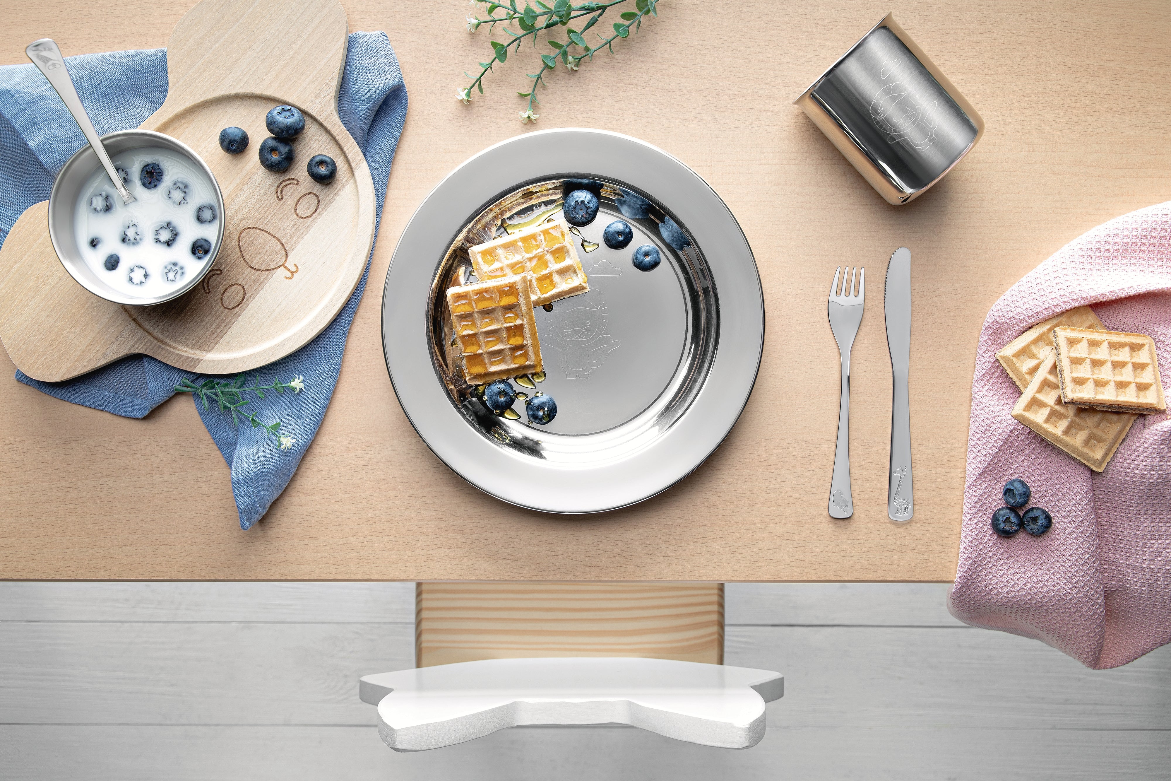 Recommended for children ages 12 months or older. Use only soap or detergent and a soft sponge to wash. Other products such as steel wool can scratch or damage the cutlery's shine. Rinse each piece well to completely remove the residue of the cleaning products that are abrasive and can damage stainless steel. Use warm water whenever possible as it renews the cutlery's shine. After washing, dry the tableware immediately otherwise the chemical substances in water (chlorine) can stain the tableware. Do not allow the tableware to rub against each other during washing and storage to prevent scratches Avoid contact with hot surfaces. They can cause the colours to fade. Do not store items in a humid place as it can cause stains. When using a dishwasher, we recommend removing the cutlery as soon as the rinse cycle is finished and drying them by hand.
