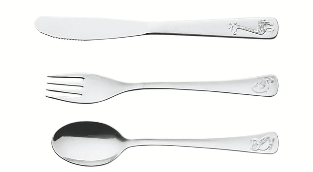 With Tramontina's 3-piece stainless steel children's flatware set with a glossy finish and relief pattern, meal times will be much more fun. The Baby Friends children's line has been specially designed for the little ones, offering ergonomic pieces with assorted relief engravings that are easy to use and make these moments happier. Each piece is made entirely of stainless steel, which does not release any particles into the food so parents can feel assured.