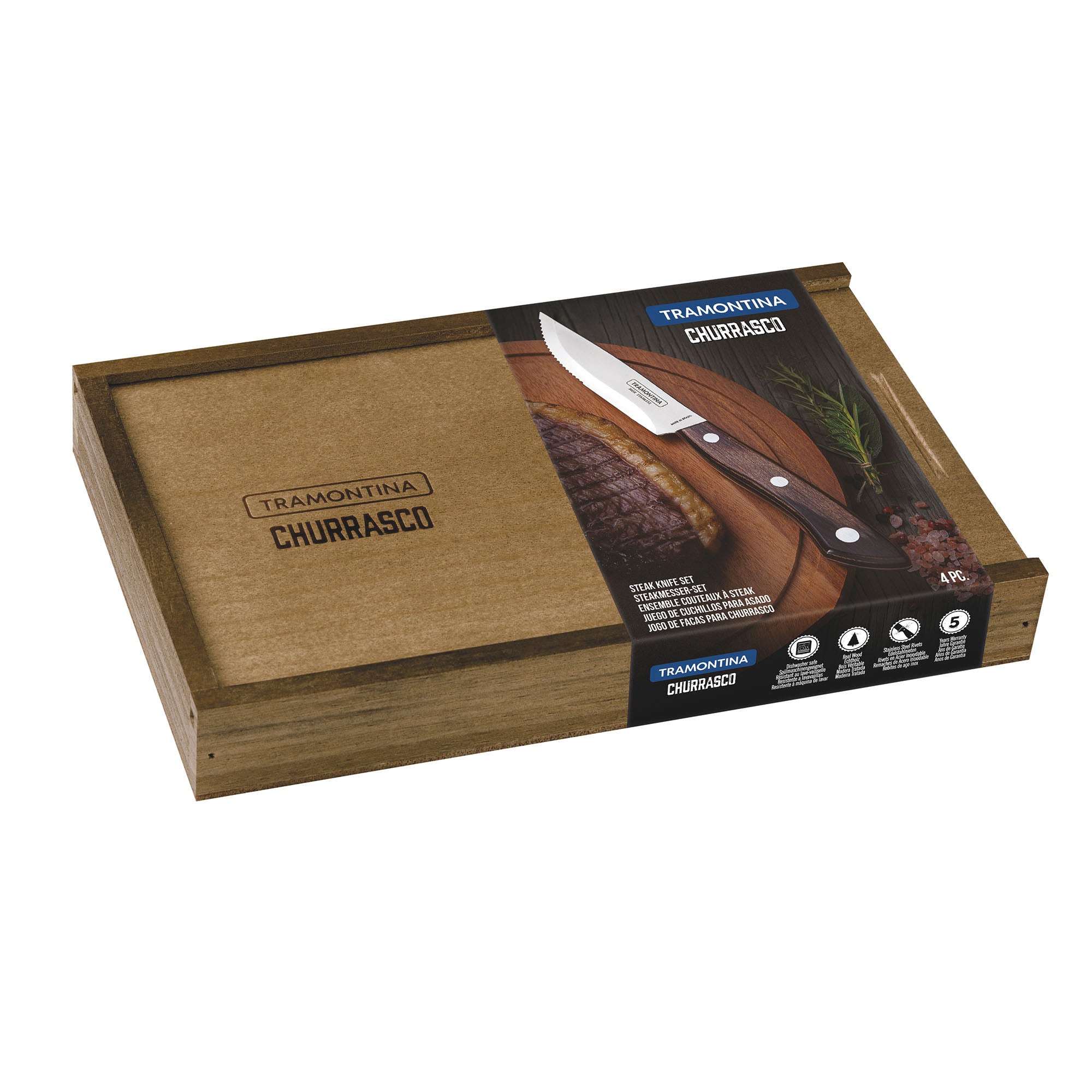 Do you know what can't be missing from your barbecue table? Tramontina's Bueno 4-piece steak knife set with stainless steel blades and brown Polywood handles, including a wooden case, from the Churrasco line.