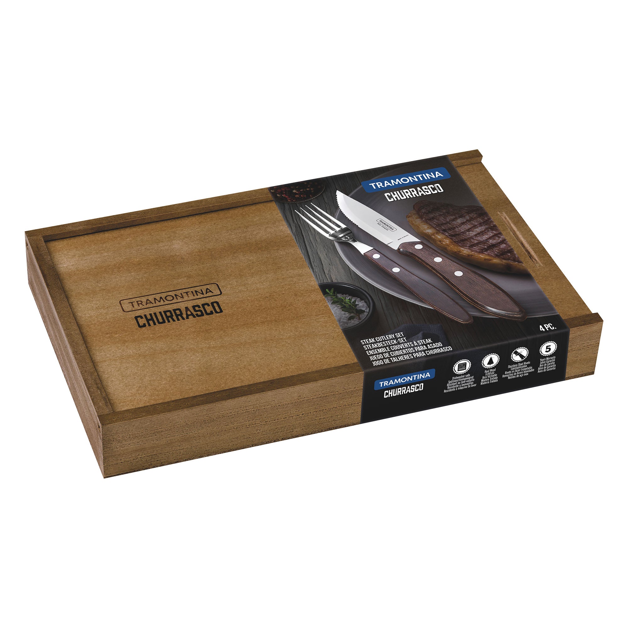 To cultivate the barbecue tradition is to use the best flatware to enjoy it. Use Tramontina's 4-piece stainless steel barbecue flatware set with brown Polywood handles and wood case and feel the difference with each bite.