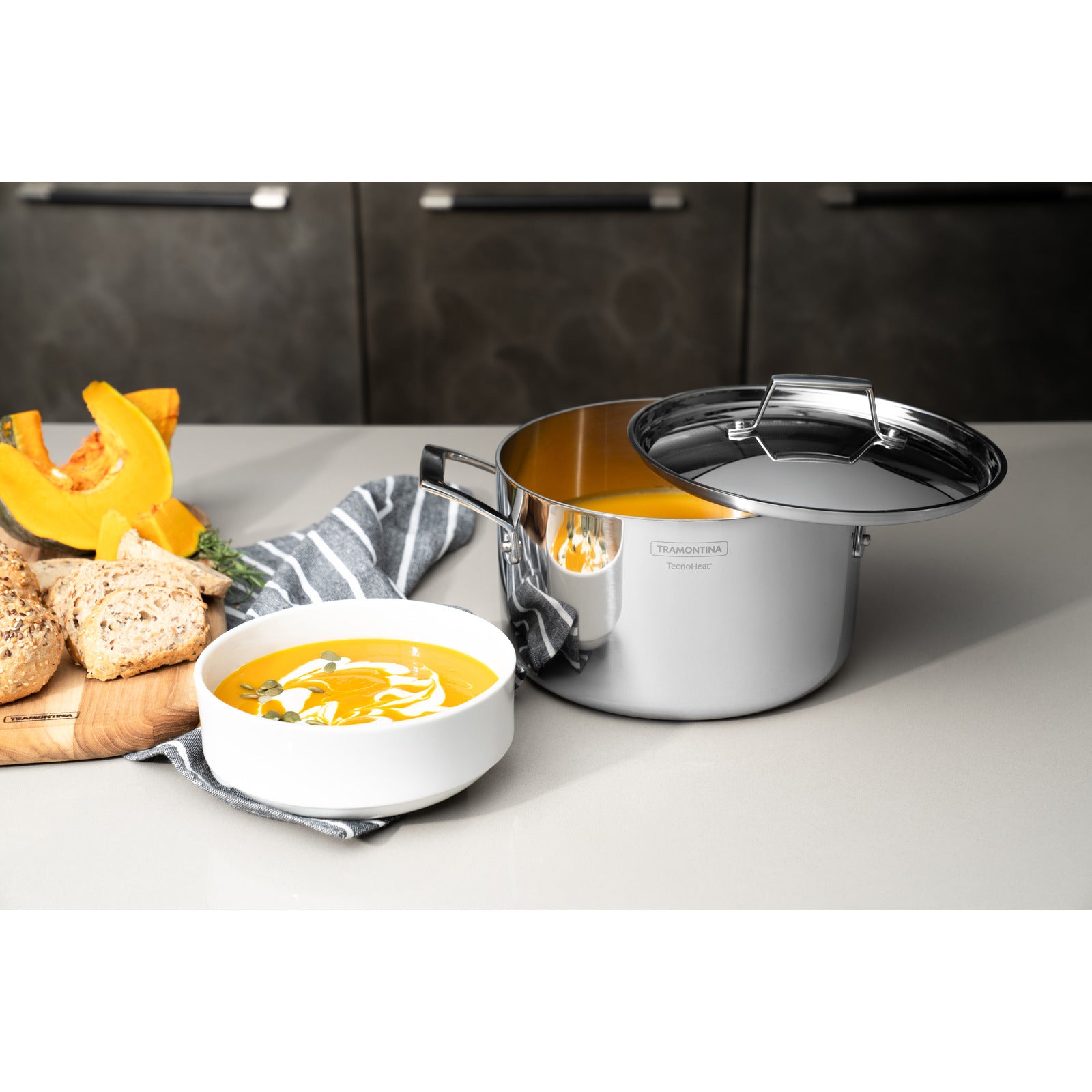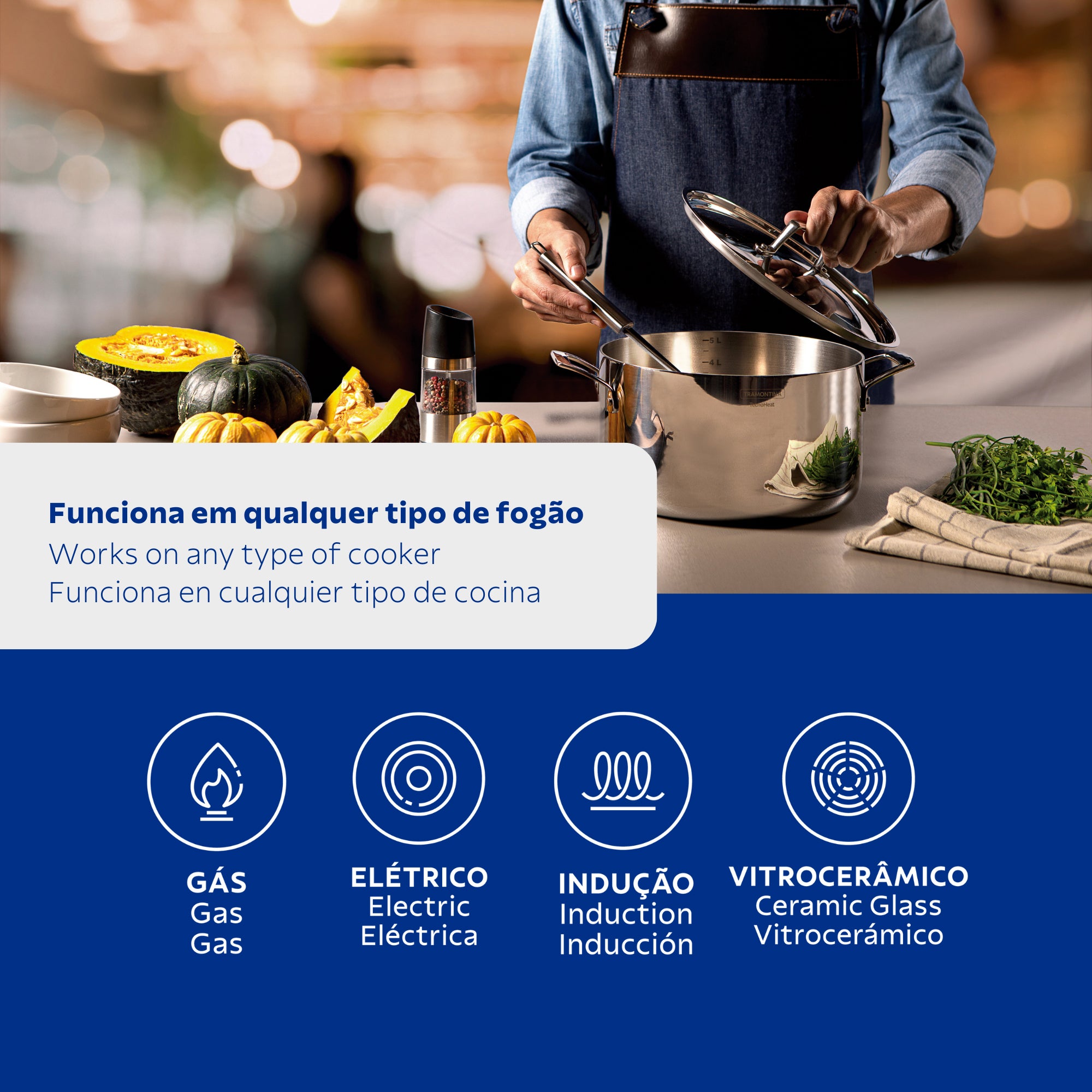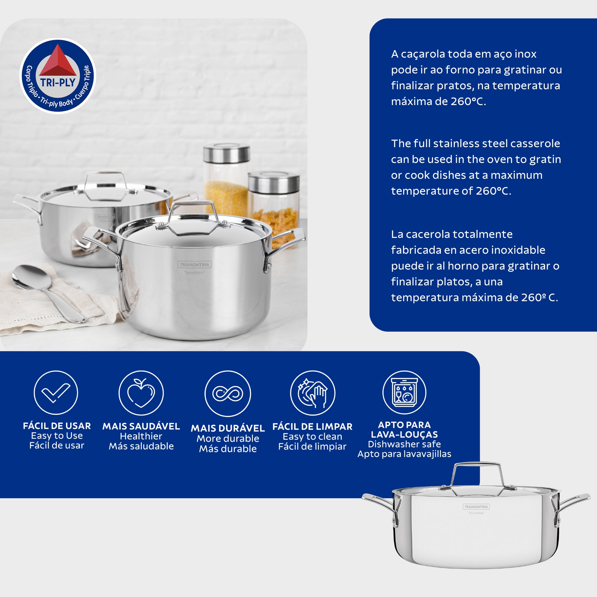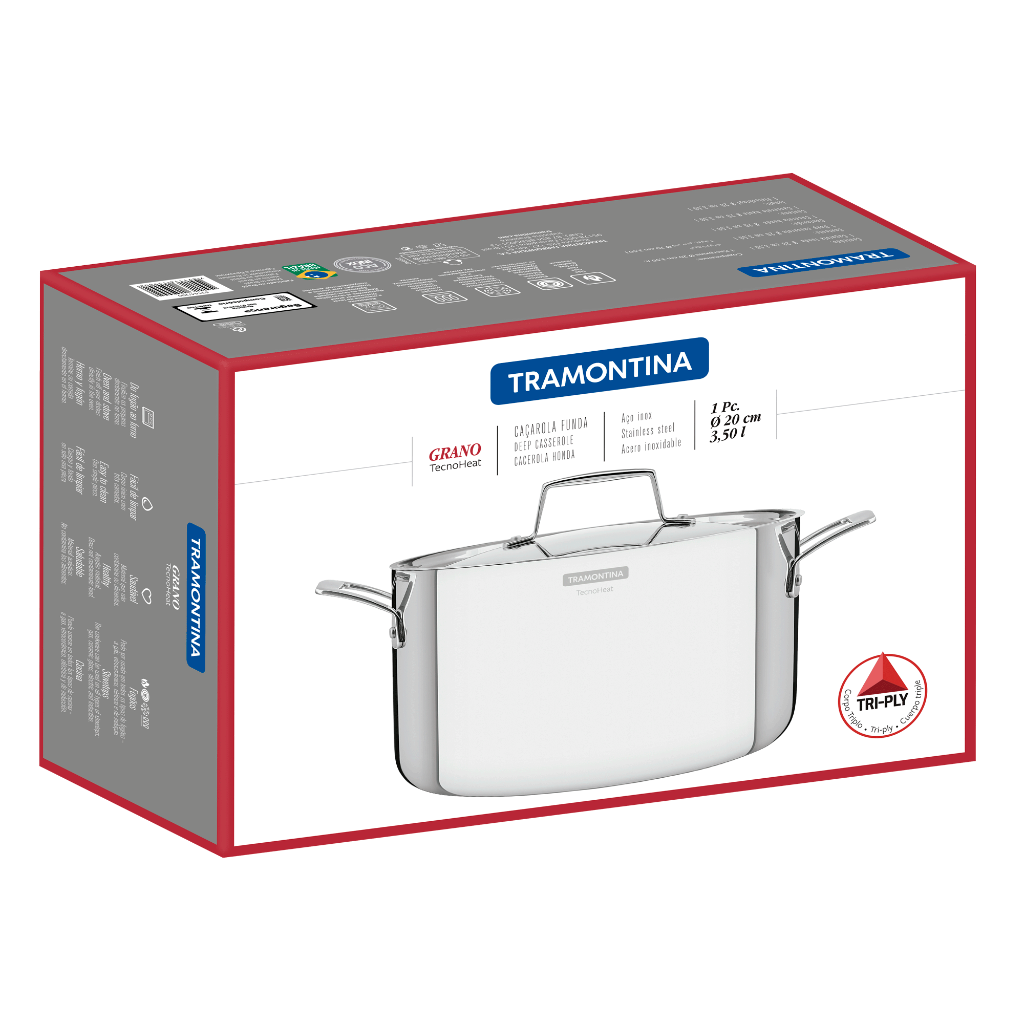 Beauty that goes from the kitchen to the table. With Tramontina's 20 cm 3.8 L stainless steel deep casserole dish with tri-ply body, lid and handles from the Grano line, you will be able to prepare your meals with convenience, guaranteeing the quality of your dishes. Made entirely of stainless steel, it does not release any particles into the food, keeping it healthy and flavorful. This Tramontina casserole dish combines design with state-of-the-art technology in its manufacture, bringing to your daily routine the tri-ply body (stainless steel + aluminum + stainless steel), which provides faster and more uniform cooking as it distributes heat evenly. Functionality and beauty that can't go amiss in your daily routine.