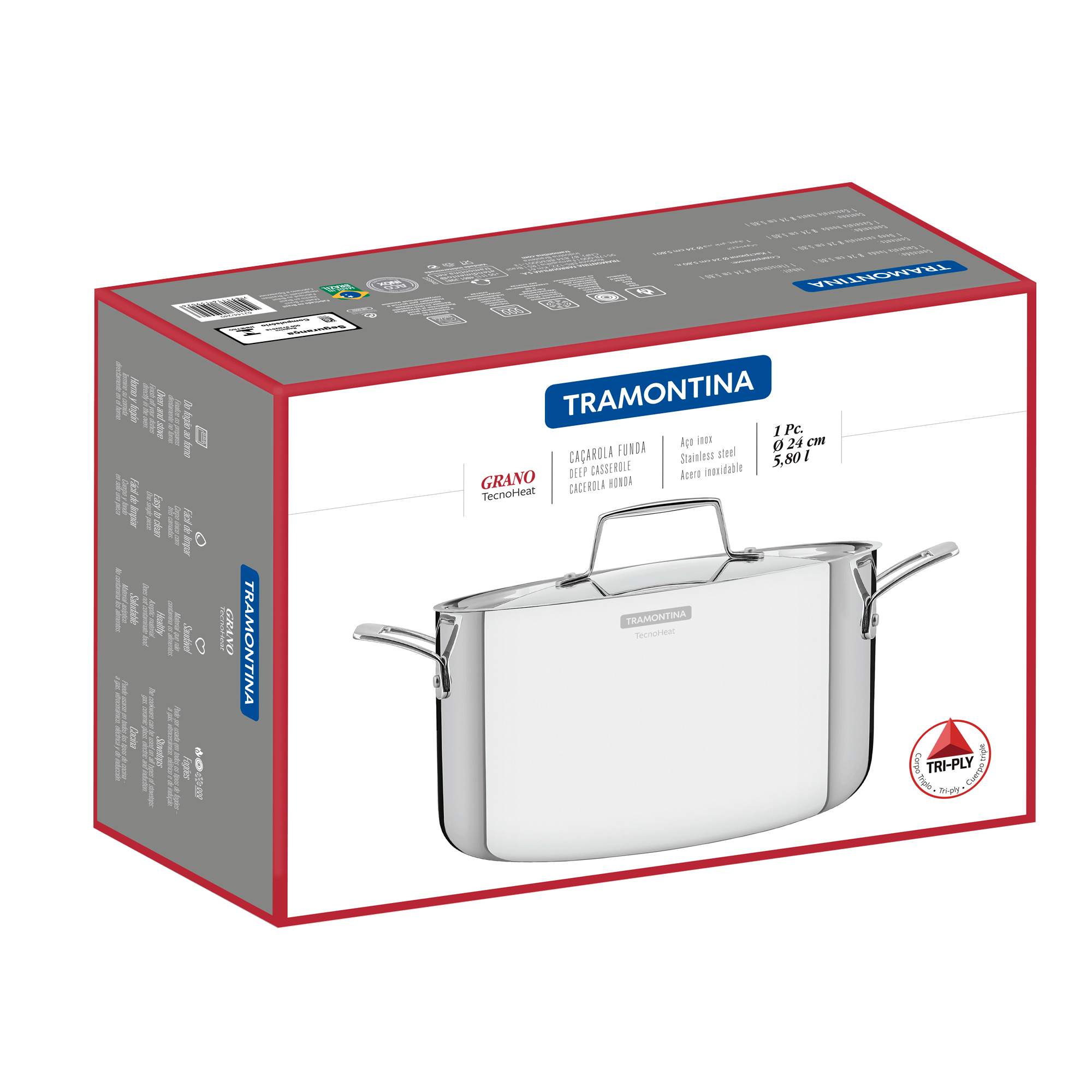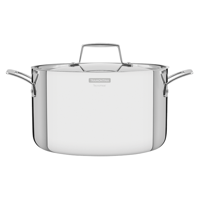 Let the beauty and functionality of stainless steel shine bright in your kitchen with Tramontina's 24 cm 5.8 L stainless steel deep casserole dish with tri-ply body, lid and handles from the Grano line. A highly durable, high-quality product that adds convenience to your daily routine, allowing you to prepare even more delicious meals. The tri-ply body (stainless steel + aluminum + stainless steel) distributes heat evenly for faster and more uniform cooking, keeping food warm for longer and saving energy and gas. This Tramontina casserole dish combines design with state-of-the-art technology, making your kitchen and table even more charming.