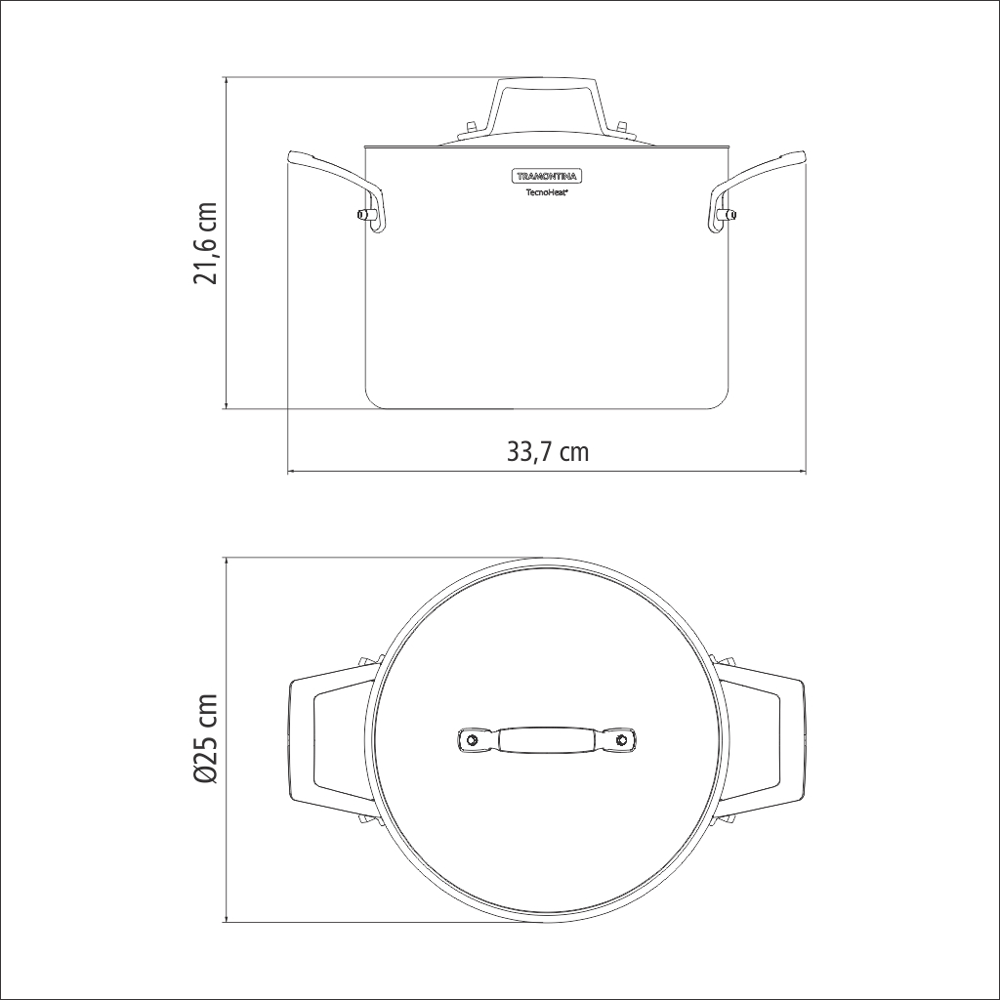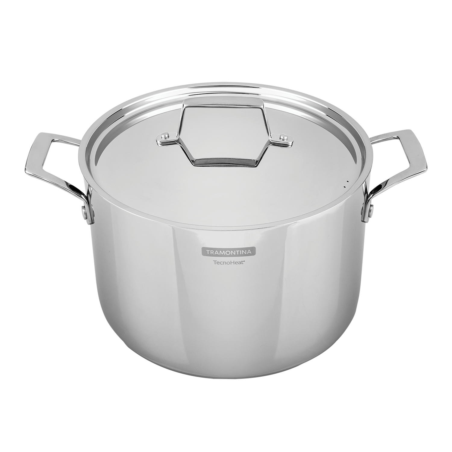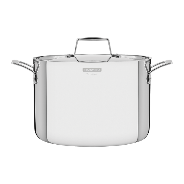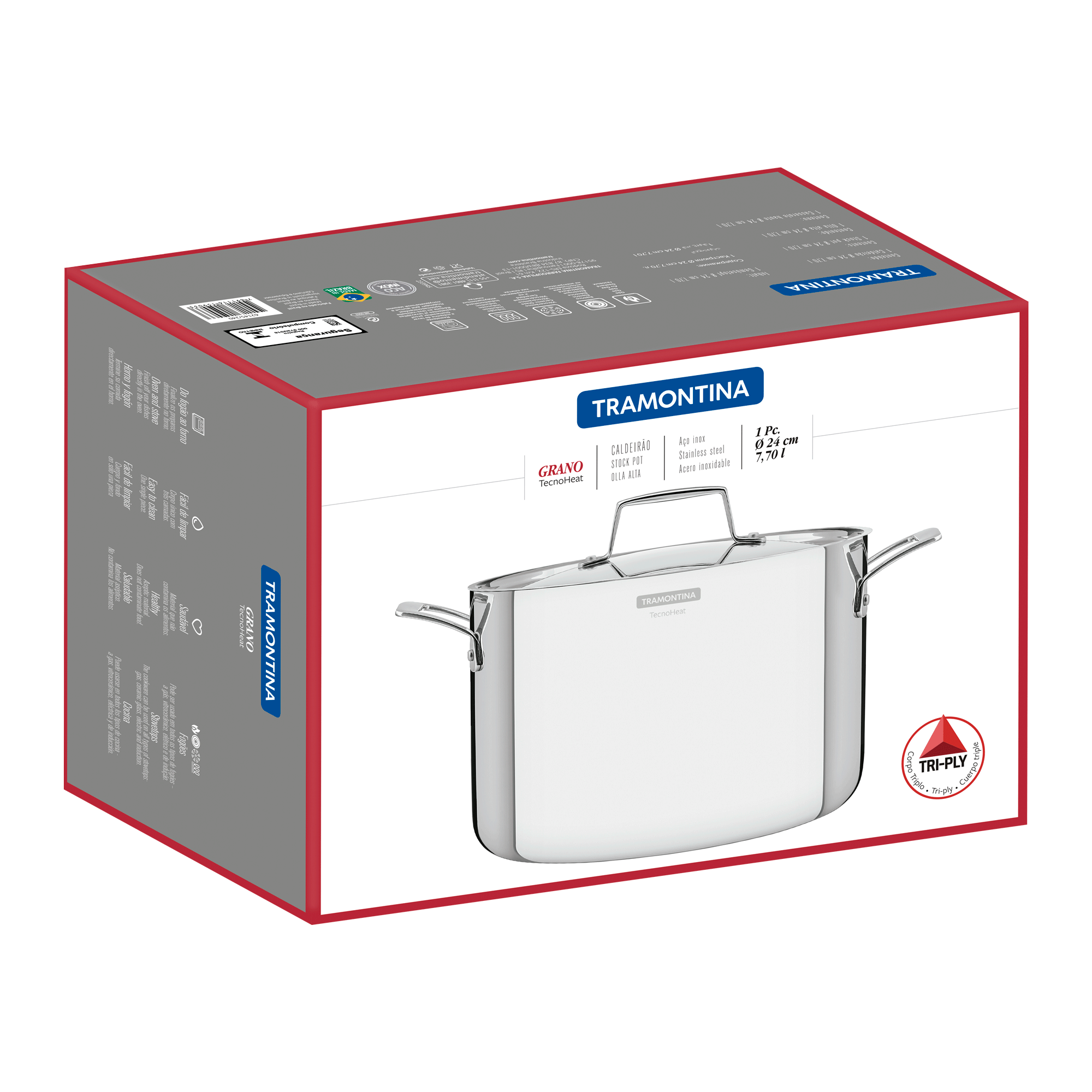 With Tramontina's 24 cm 7.7 L stainless steel stock pot with tri-ply body, lid and handles from the Grano line, you can combine convenience, style, good taste and beauty when cooking for yourself and your family. Its tri-ply body (stainless steel + aluminum + stainless steel) technology provides faster and uniform cooking and keeps food warm for longer. With its distinguished stainless steel design, it does not release any particles into the food and the high-gloss finish means it can be taken directly to the table, making your kitchen more beautiful. The lid fits perfectly and the stock pot can be used on gas, electric, glass ceramic and induction cookers. It can also be washed in the dishwasher on a daily basis without damaging its efficiency or quality. More economy, health, technology and beautiful moments for you and your family.