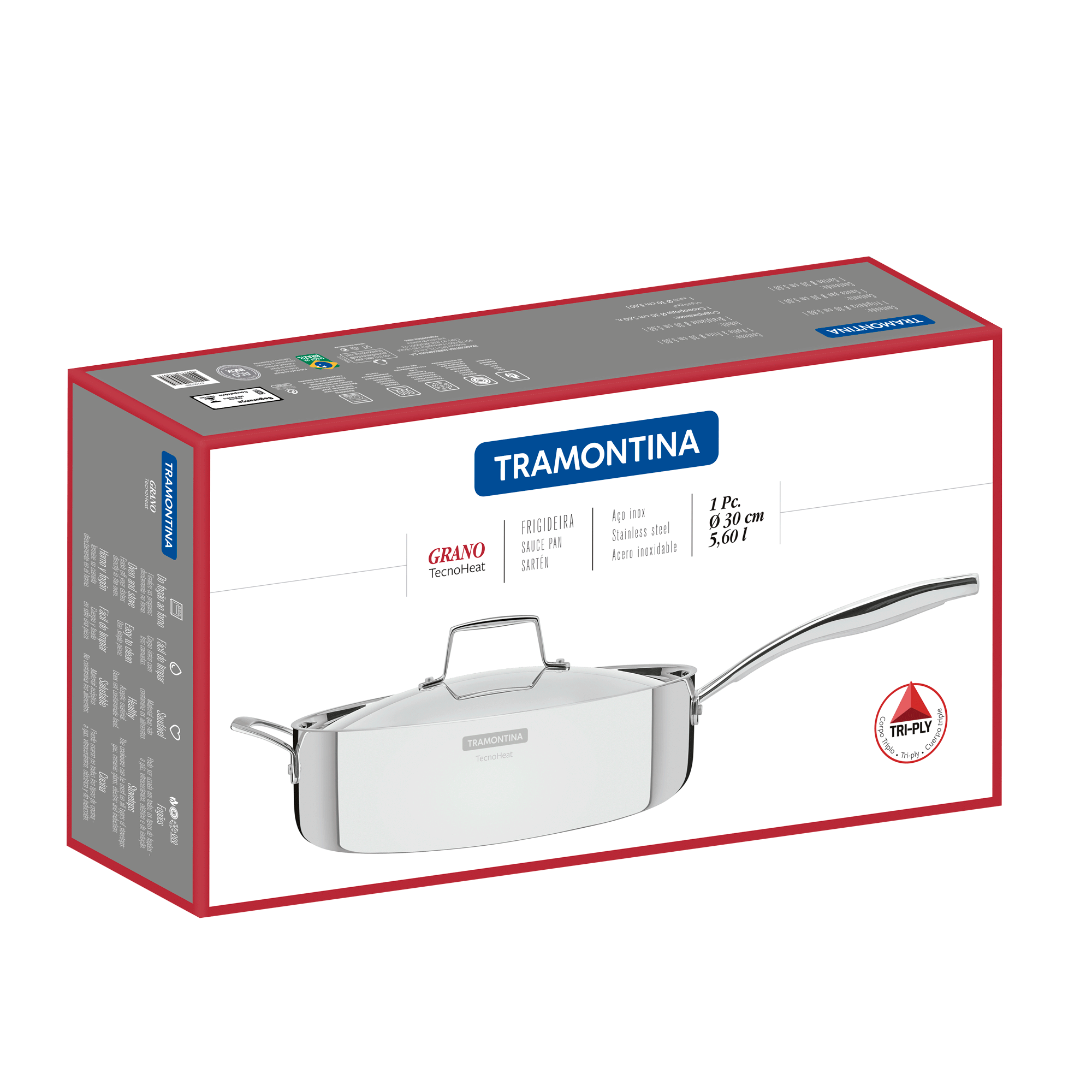With Tramontina's Grano 30 cm 5.6 L stainless steel frying pan with tri-ply body, lid and long handle you can combine convenience, style, good taste and beauty when cooking for yourself and your family. Its triple body (stainless steel + aluminum + stainless steel) technology provides faster and uniform cooking and keeps food warm for longer. With its distinguished stainless steel design, it does not release any particles into the food and with its high-gloss finish it can be taken to the table, making your kitchen more beautiful. The lid fits perfectly and the frying pan can be used on gas, electric, glass ceramic and induction cookers. It can also be washed in the dishwasher on a daily basis without damaging its efficiency or quality. More economy, health, technology and beautiful moments for you and your family.
