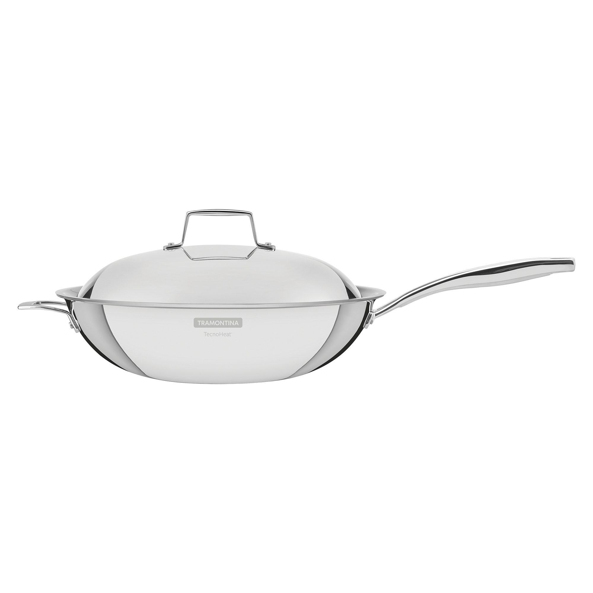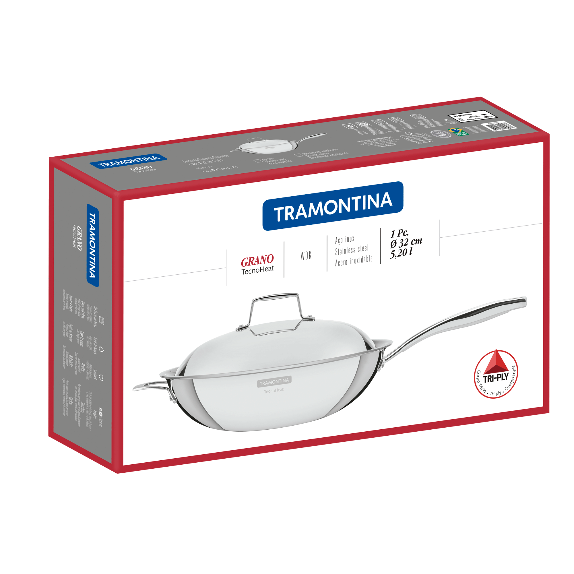 Your cooking experiences will get a special touch with Tramontina's 32 cm 5.2 L stainless steel wok with tri-ply body, lid and long handle from the Grano line. Made entirely of highly durable stainless steel, which does not release any particles into the food, it maintains its original quality. With a clean look with no corners, it's very easy to clean and can be washed in the dishwasher on a daily basis. The tri-ply base (stainless steel + aluminum + stainless steel) technology distributes heat evenly for faster cooking, which keeps food warm for longer and It also saves energy. Its modern, sophisticated design with a high-gloss finish makes it a perfect choice to be taken to the table. This incredible pan can be used on the stovetop and in the oven to finish cooking.